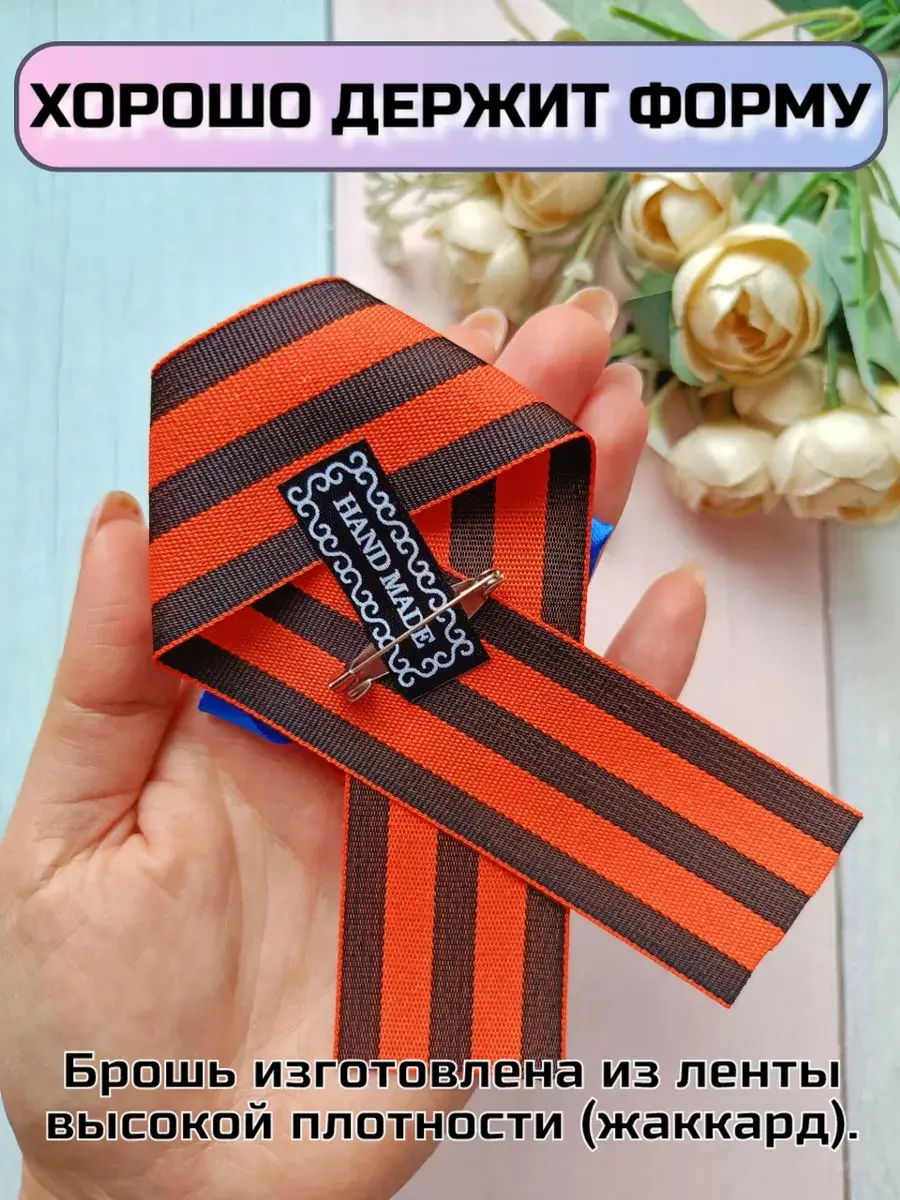 Брошь "Георгиевская ленточка" выполнена из репсовой и атласной лент и пластикового кабошона. Хорошо держит форму и надежно прикреплена к металлической булавке.