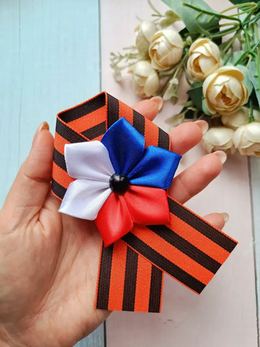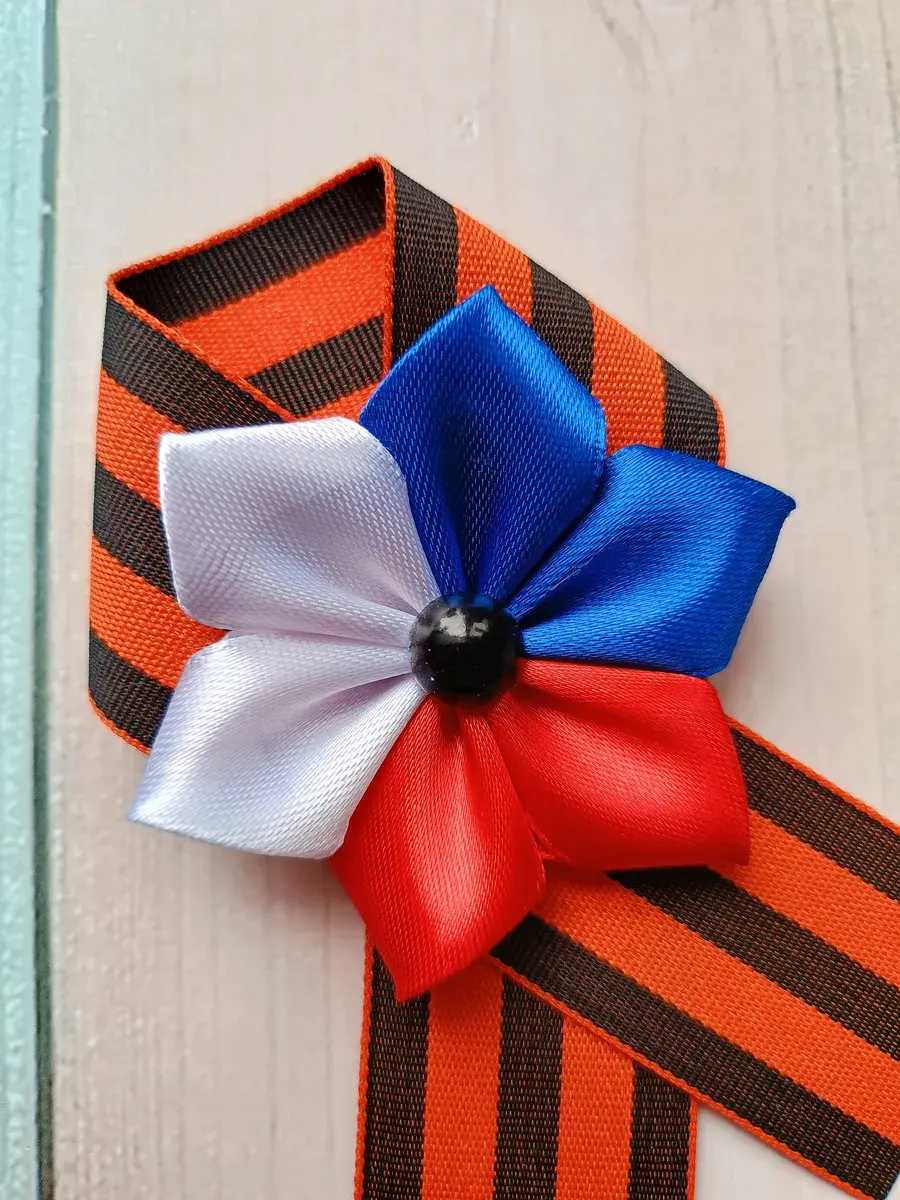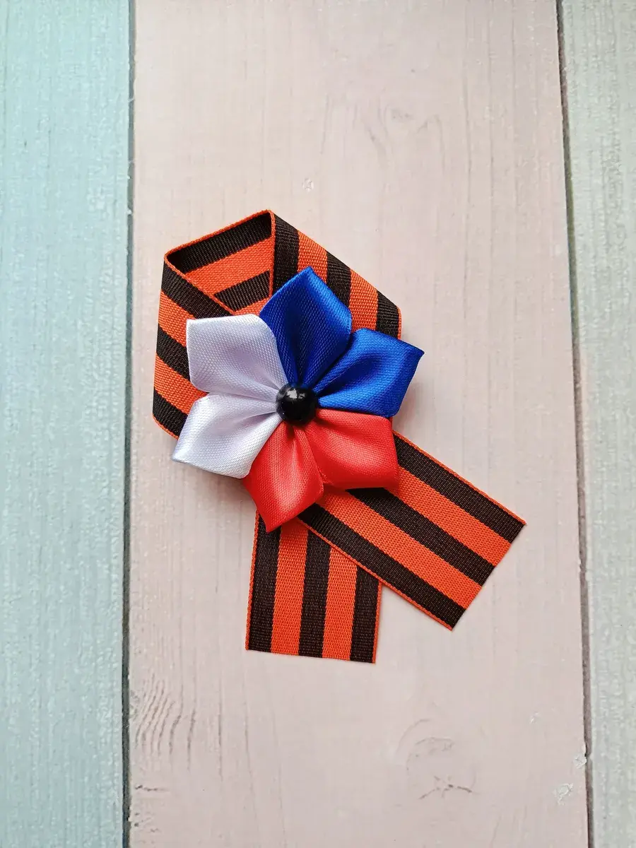 Брошь "Георгиевская ленточка" выполнена из репсовой и атласной лент и пластикового кабошона. Хорошо держит форму и надежно прикреплена к металлической булавке.