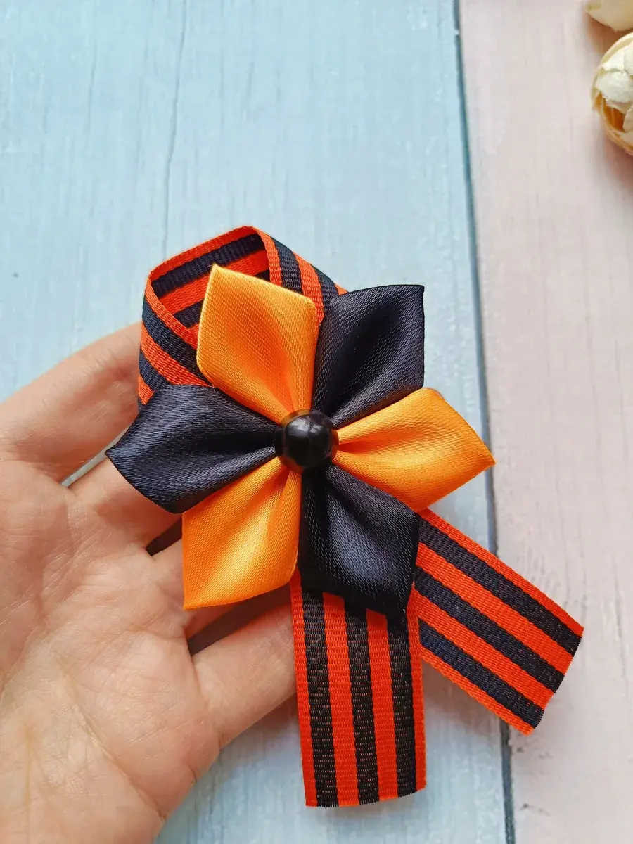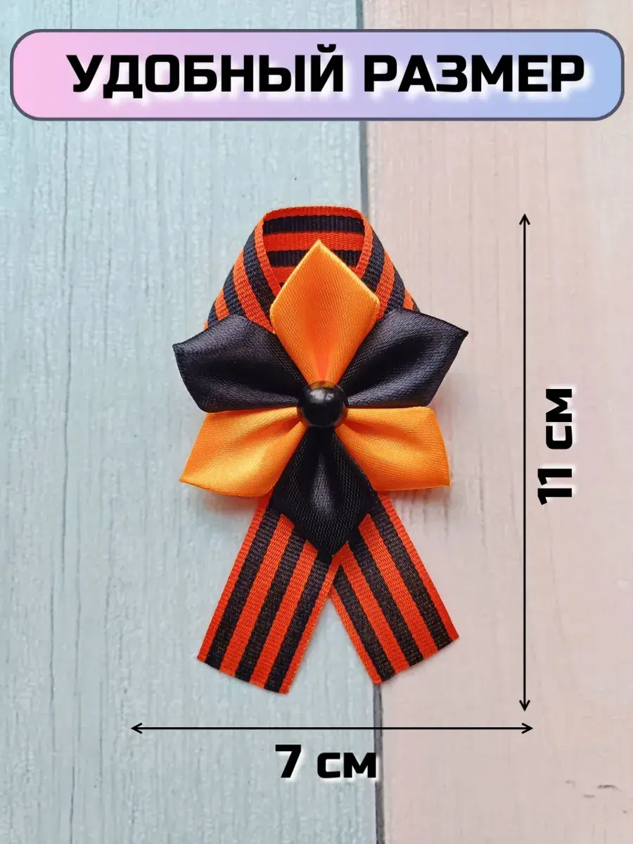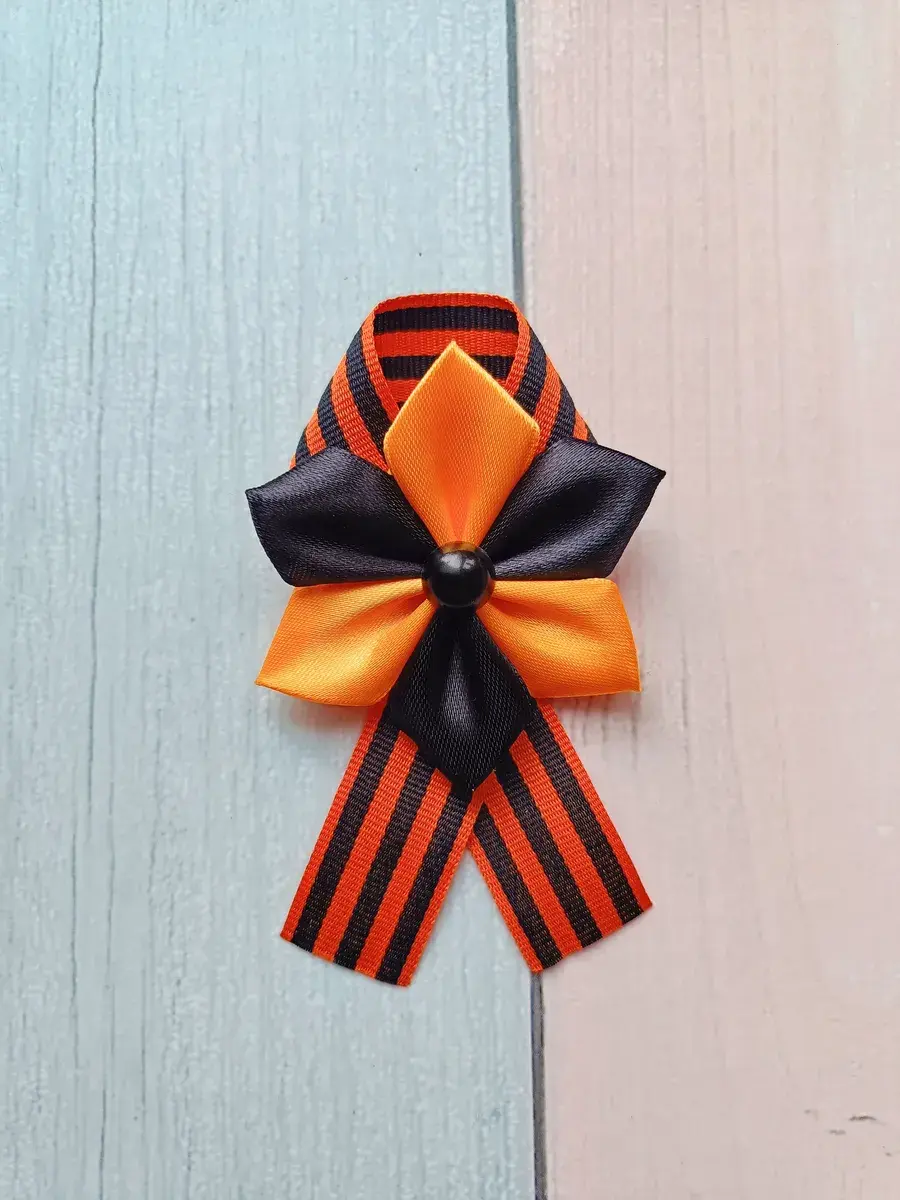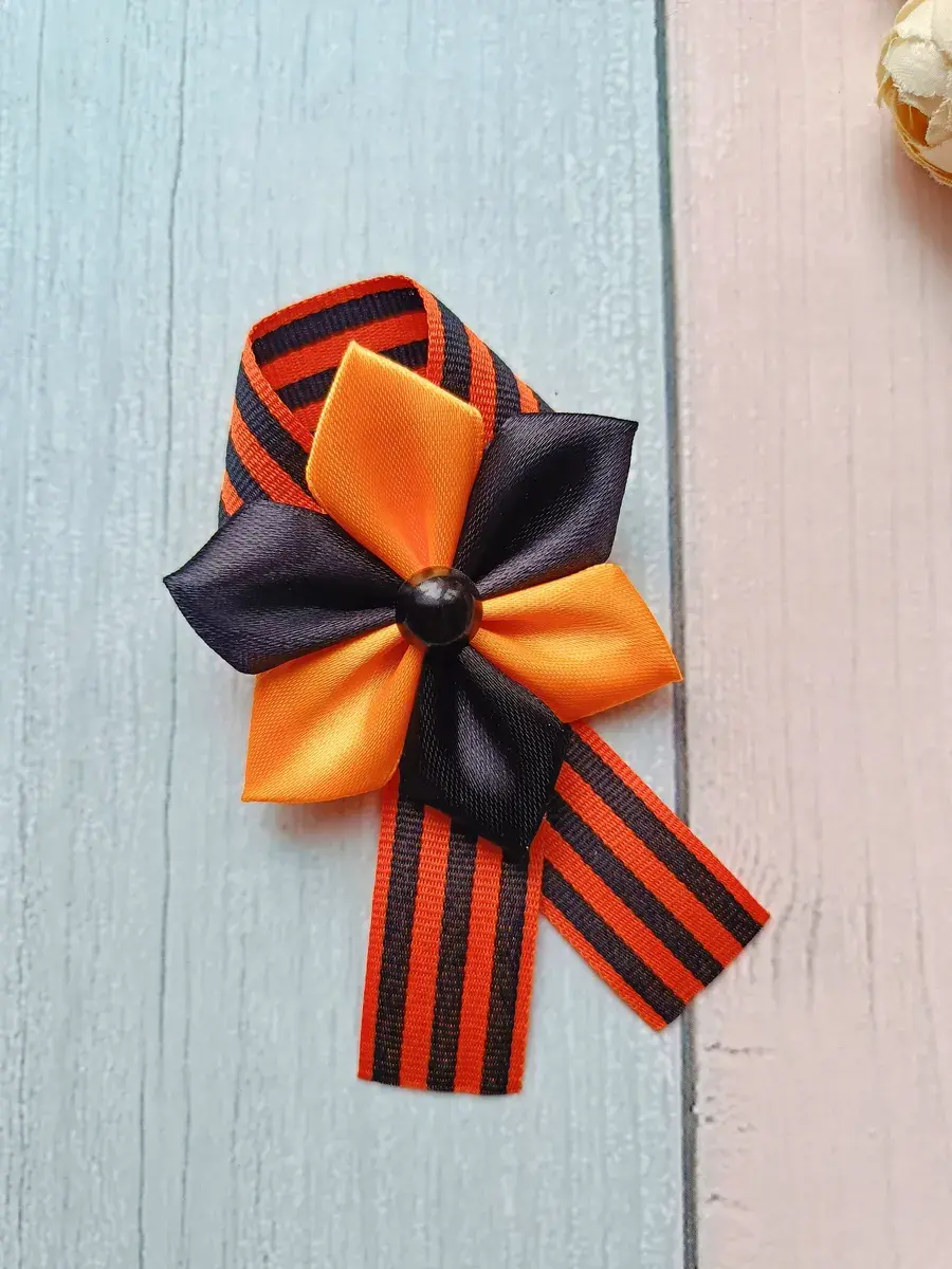 Брошь "Георгиевская ленточка" выполнена из репсовой и атласной лент и пластикового кабошона. Хорошо держит форму и надежно прикреплена к металлической булавке. Размер броши: 11х7(+-1)см.