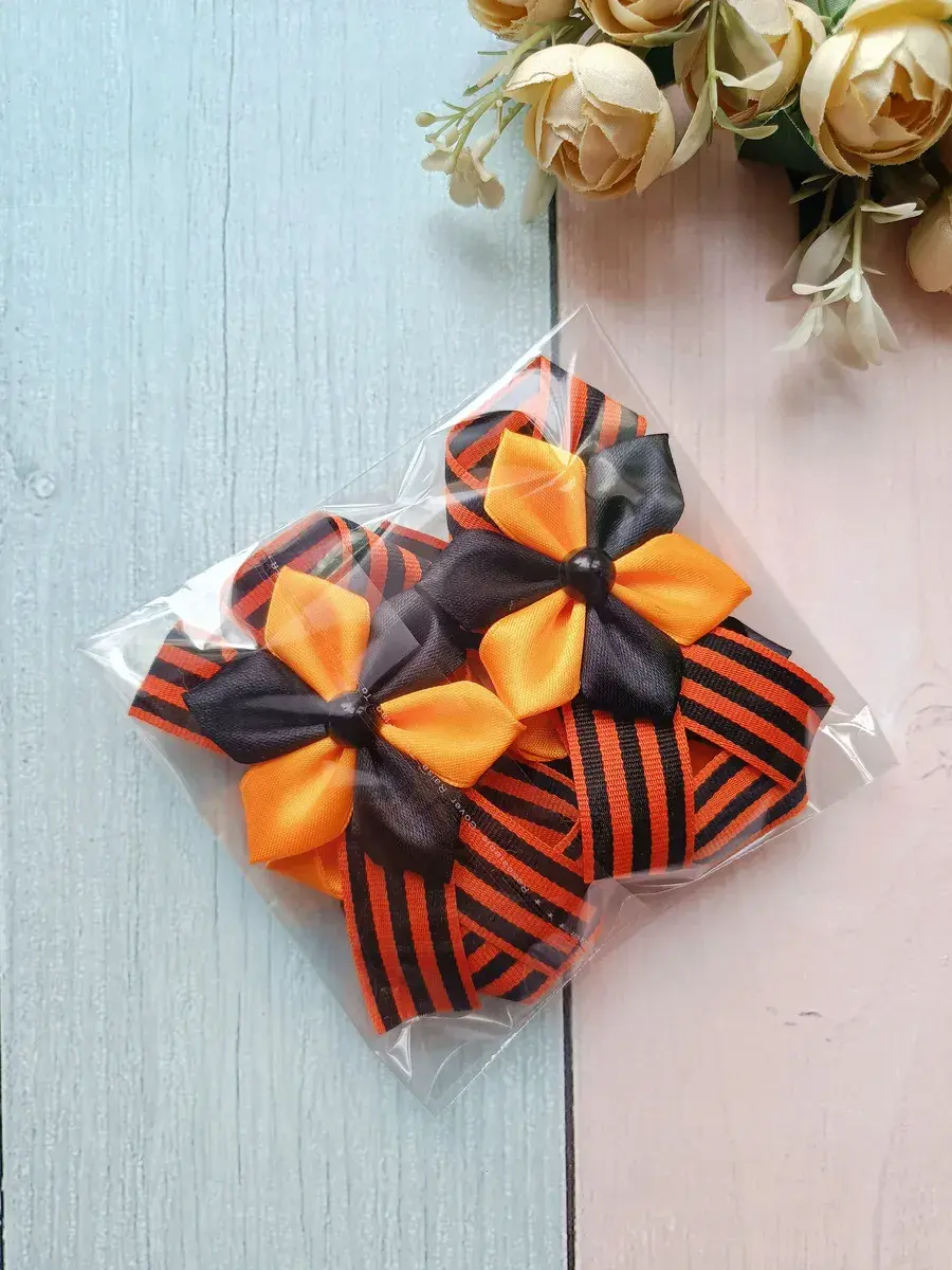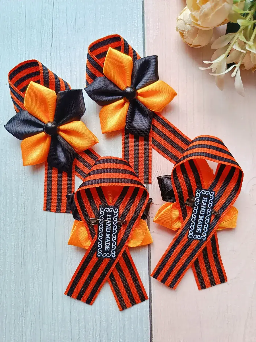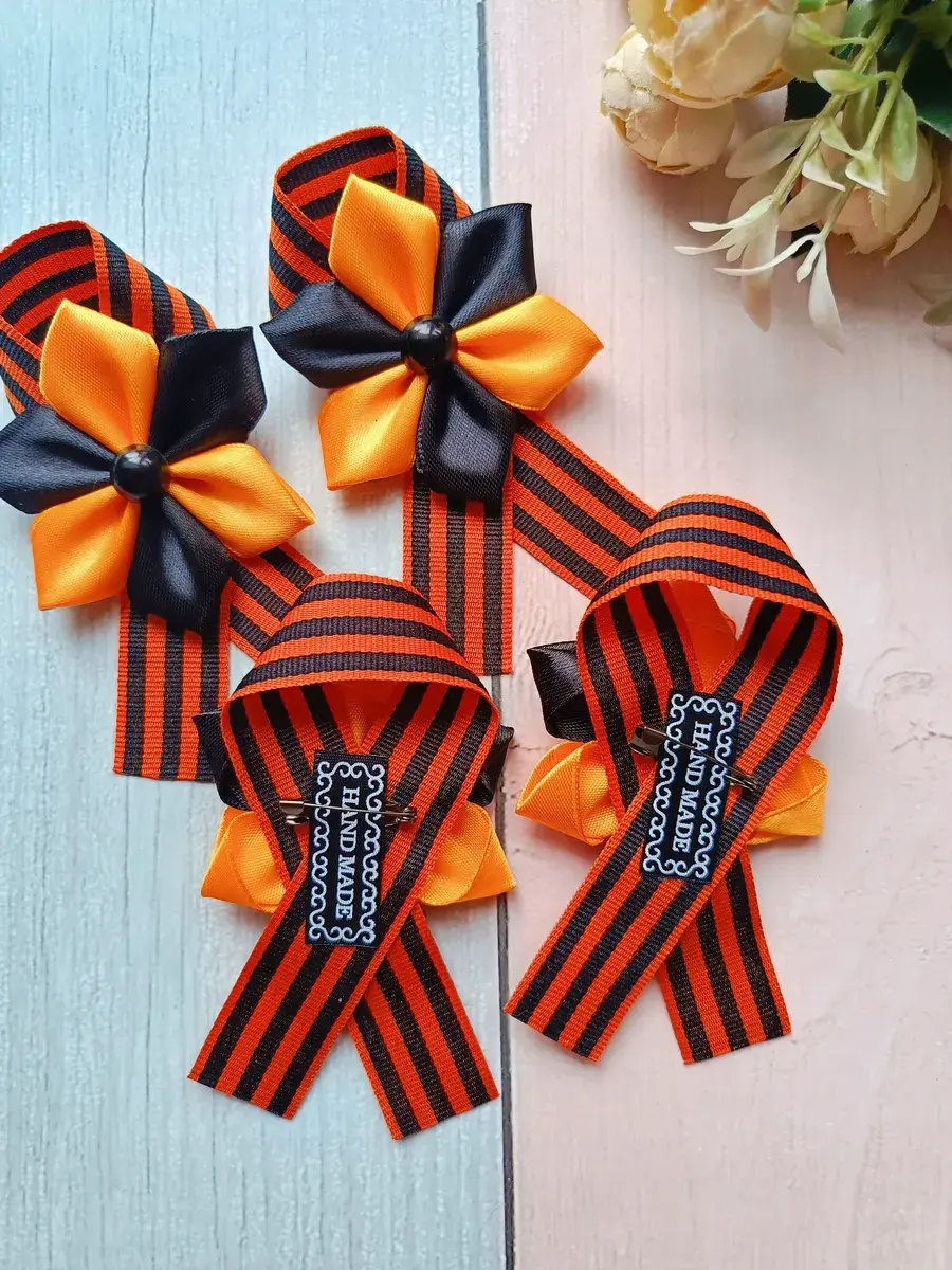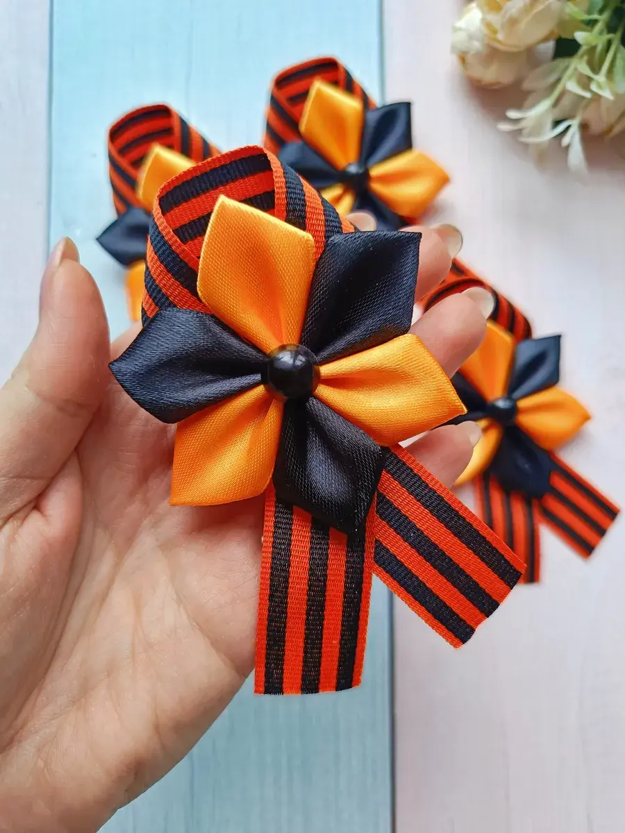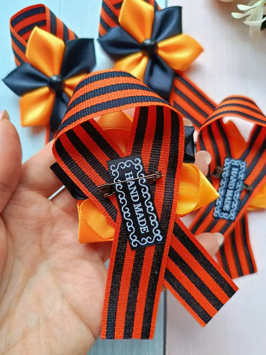 Брошь "Георгиевская ленточка" выполнена из репсовой и атласной лент и пластикового кабошона. Хорошо держит форму и надежно прикреплена к металлической булавке. Размер броши: 11х7(+-1)см.