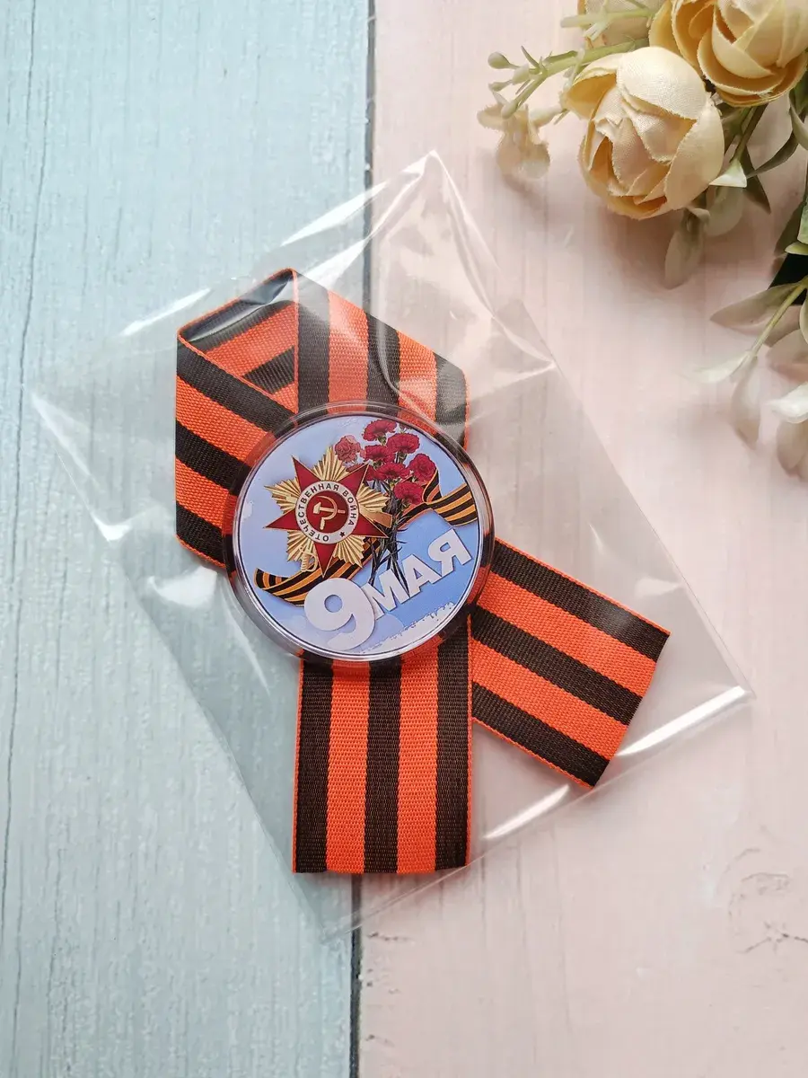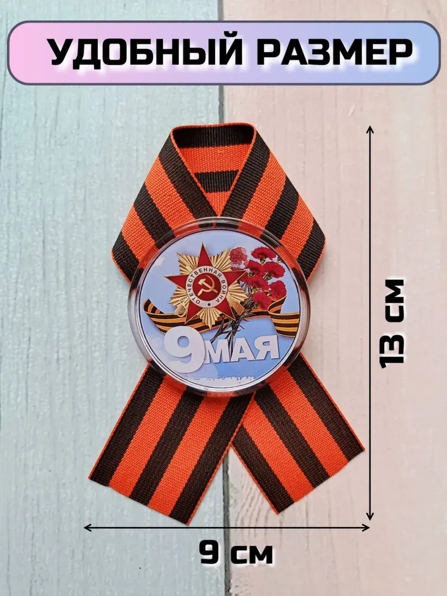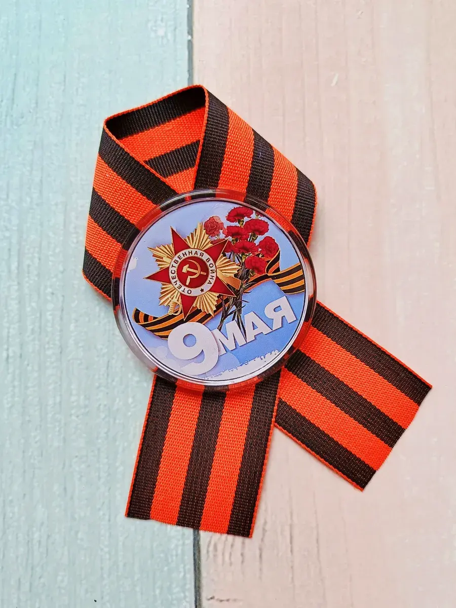 В комплекте георгиевская лента (размер: 13х9(+-1)см) и пластиковый акриловый значок диаметром 5см. Индивидуальная упаковка. Разные дизайны. Подойдут мужчинам, женщинам и детям.
