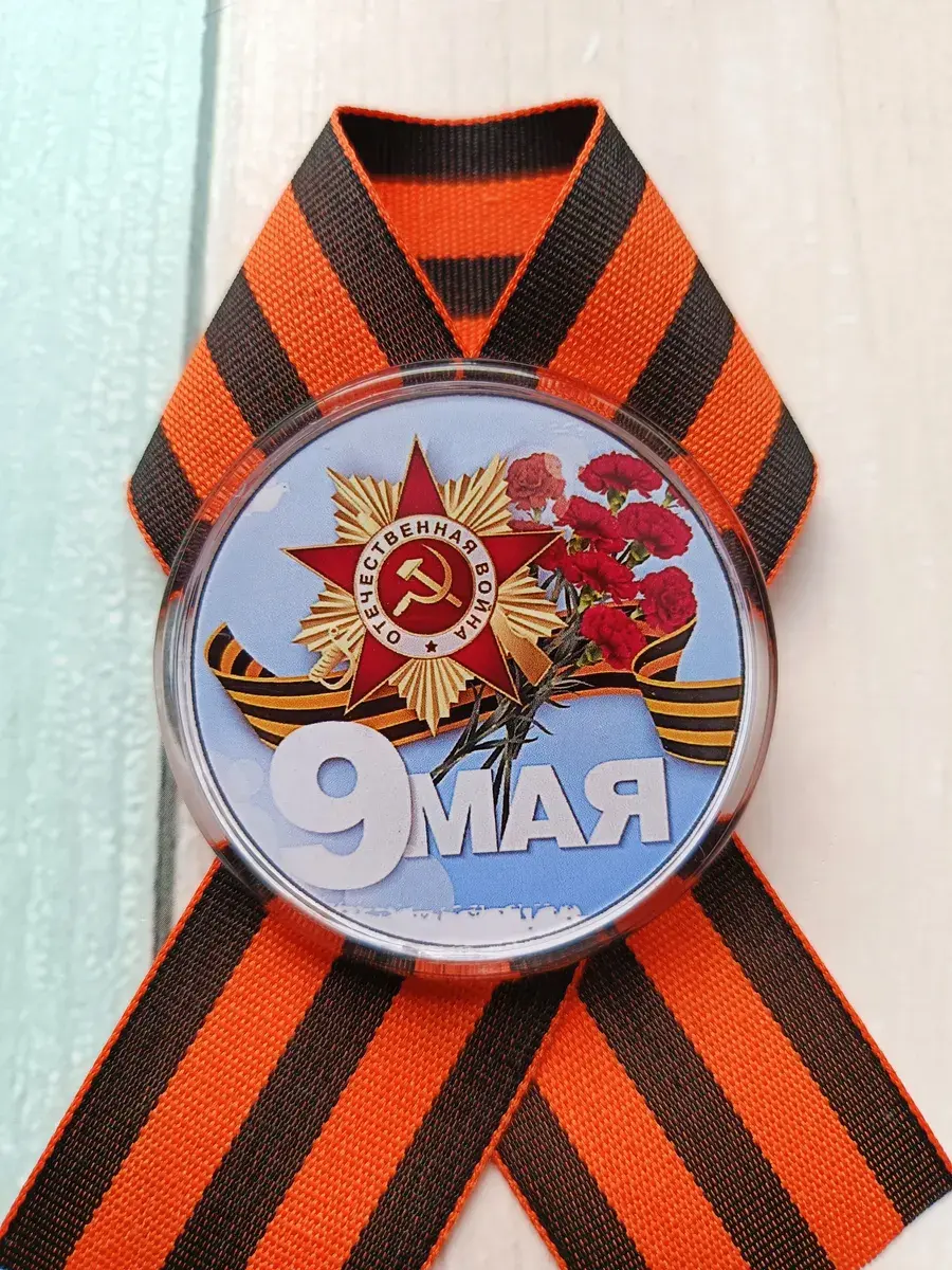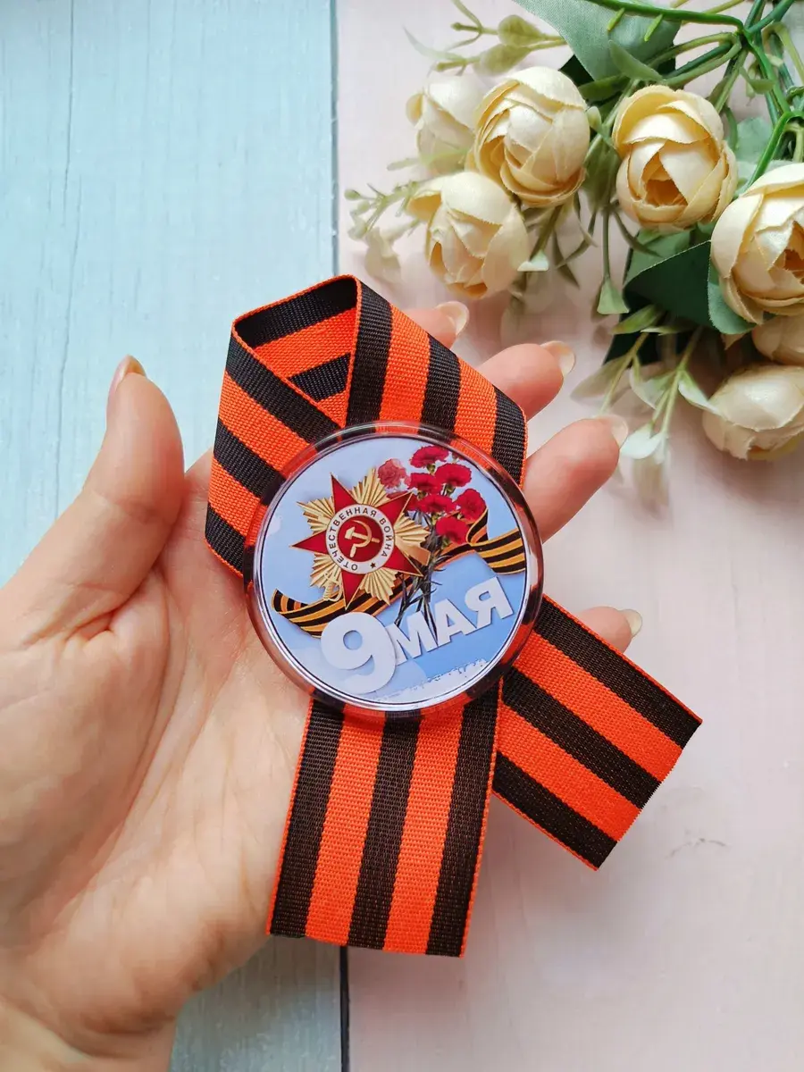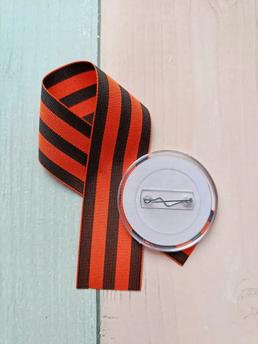 В комплекте георгиевская лента (размер: 13х9(+-1)см) и пластиковый акриловый значок диаметром 5см. Индивидуальная упаковка. Разные дизайны. Подойдут мужчинам, женщинам и детям.