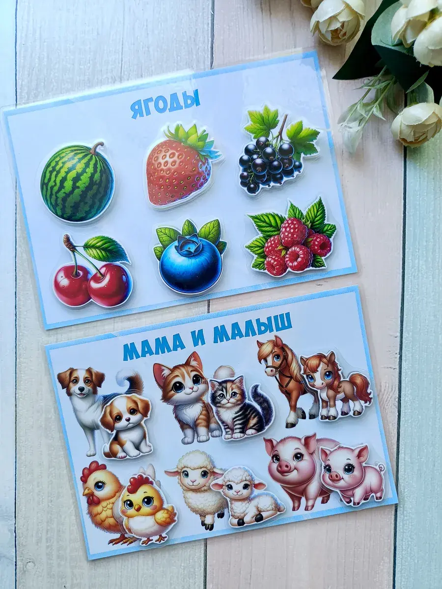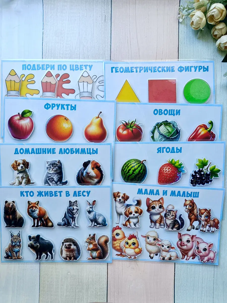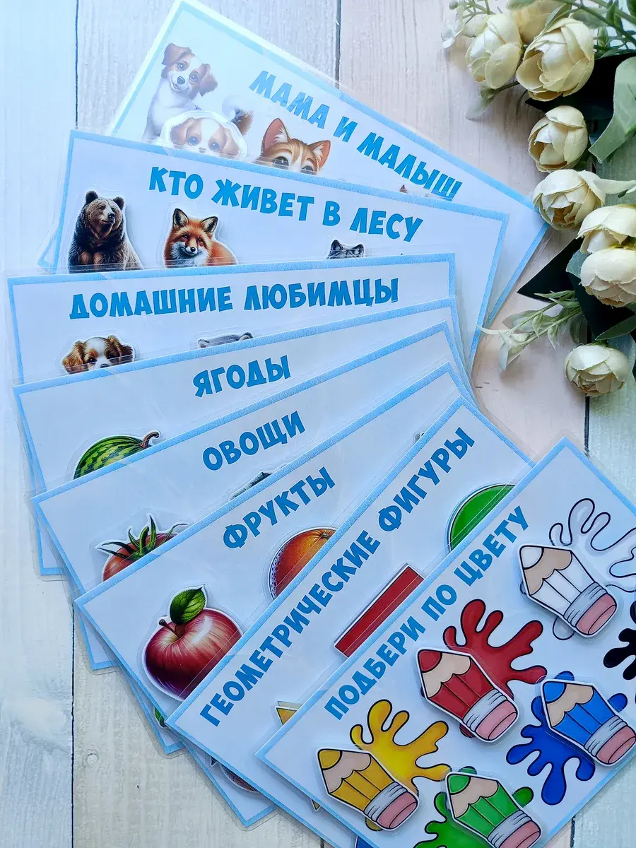 Комплект включает в себя 8 игр формата А5: цвета и геометрические фигуры, овощи, фрукты и ягоды, домашние и лесные животные, мама и малыш. В наборе 50 деталей на липучках, которые удобно крепятся и легко отклеиваются, что делает процесс игры максимально комфортным для ребенка. Это отличная возможность для вашего малыша узнавать окружающий мир через игровую форму.