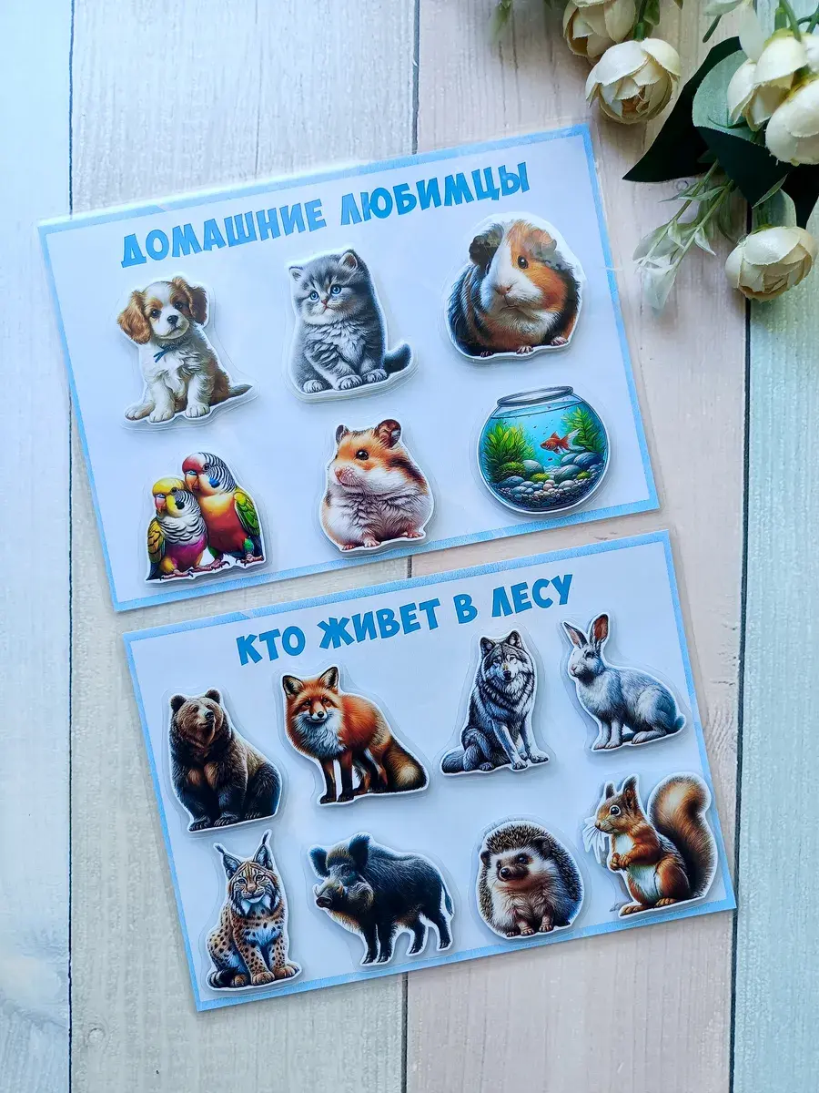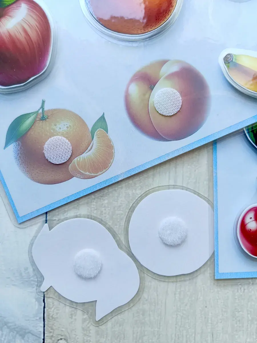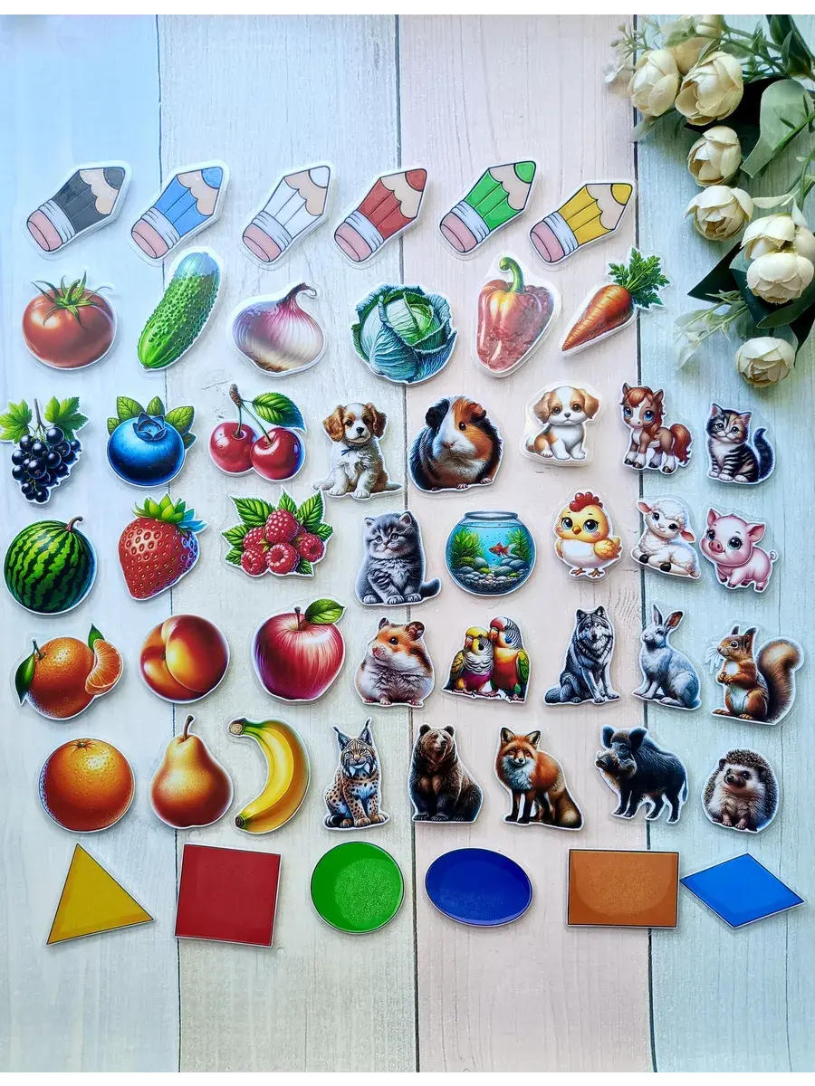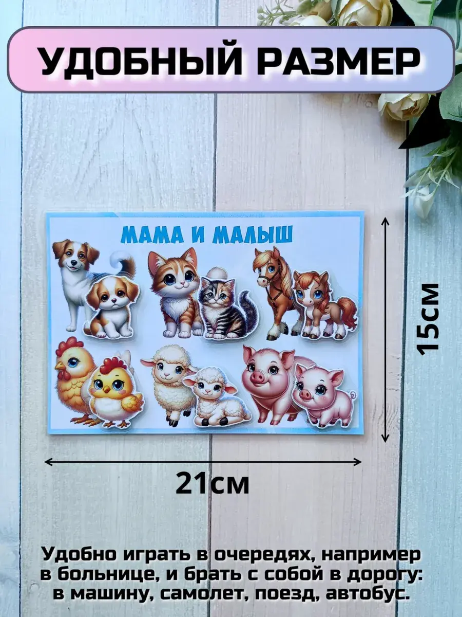 Комплект включает в себя 8 игр формата А5: цвета и геометрические фигуры, овощи, фрукты и ягоды, домашние и лесные животные, мама и малыш. В наборе 50 деталей на липучках, которые удобно крепятся и легко отклеиваются, что делает процесс игры максимально комфортным для ребенка. Это отличная возможность для вашего малыша узнавать окружающий мир через игровую форму.
