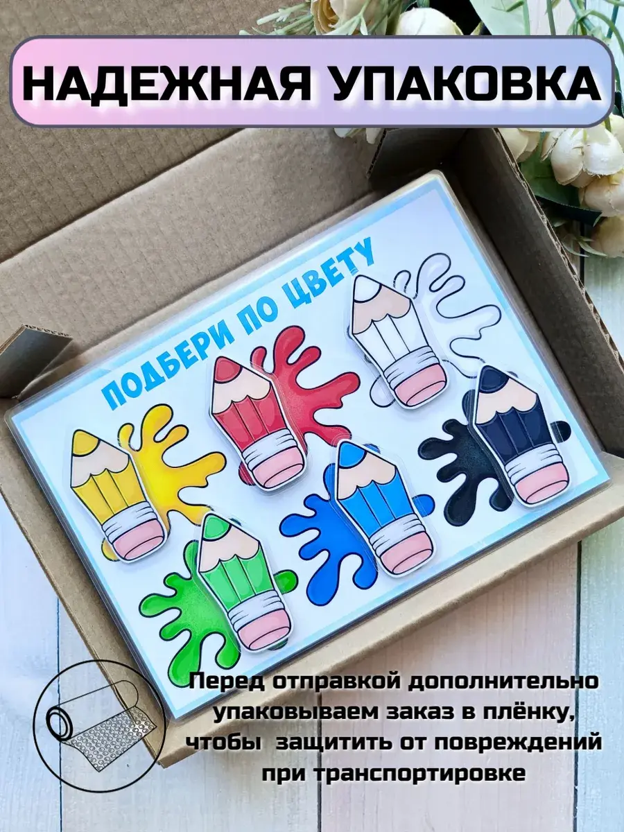 Изготовлены из плотной бумаги 250 гр и заламинированы плёнкой 175 мкм. Благодаря этому детали не рвутся, не бояться воды, слюней и других загрязнений. Достаточно протереть сухой или влажной салфеткой, делая её многоразовой развивашкой. Можно играть снова и снова.
