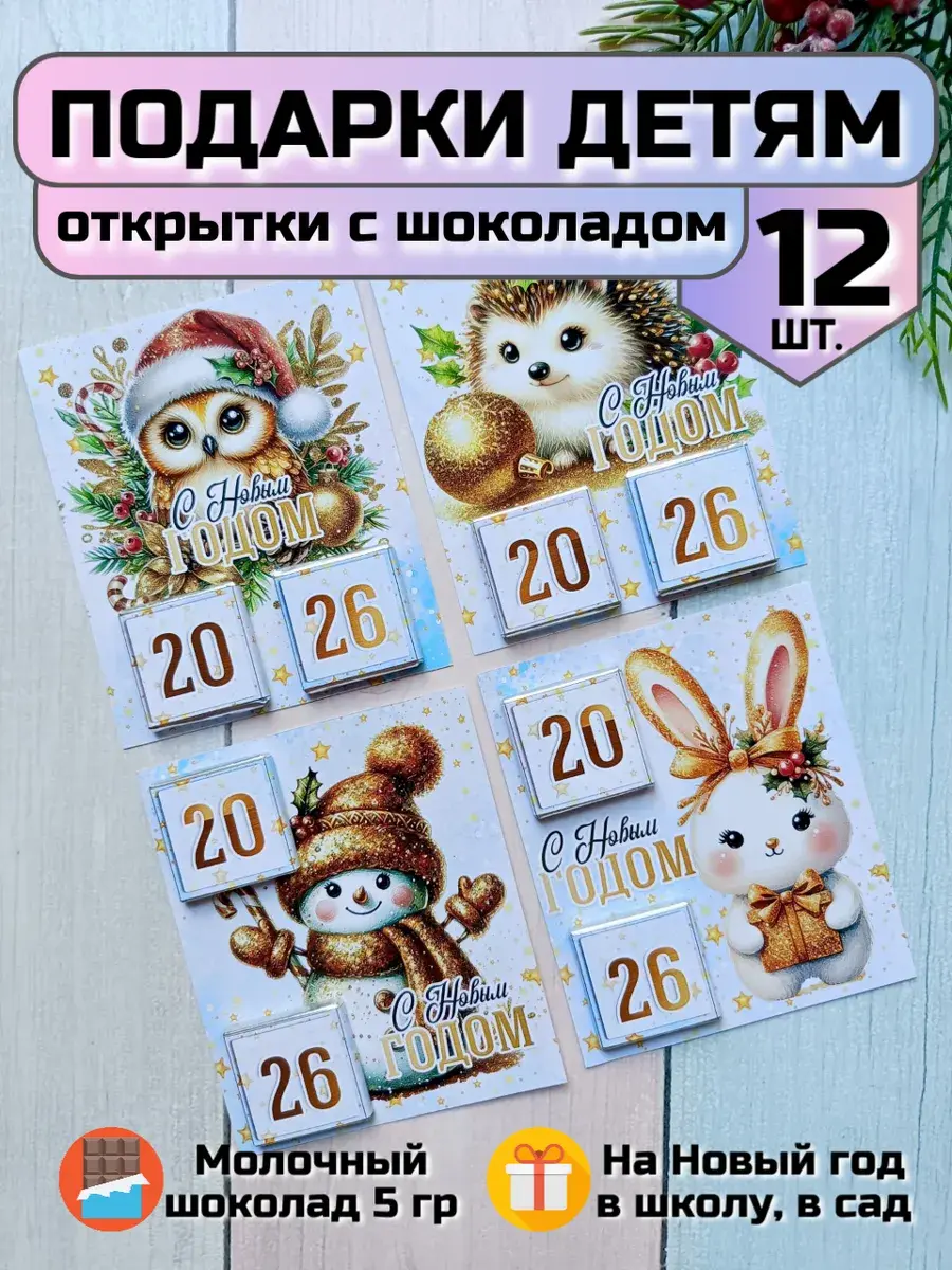 Набор сладких открыток идеально подойдет для всего класса или группы детского сада, ведь открытки сложены по 12 штук в упаковке ( все разные). А если презент останется его можно подарить сыну, дочке, друзьям детей, детям друзьям, внуку или внучке как небольшое поздравление и знак внимания, который послужит отличным угощением к чаю. Яркие открытки с добрыми пожеланиями не оставят никого равнодушным и шоколад добавит вкусную нотку в предвкушении новогоднего волшебства и зимних каникул.