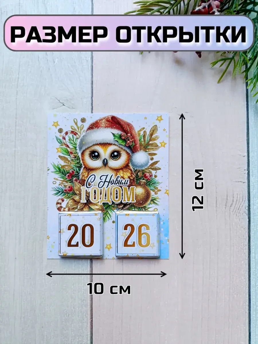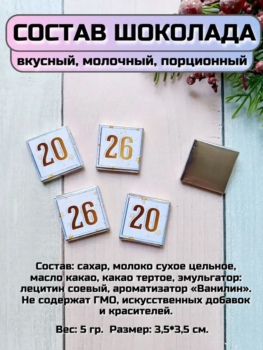 Размер открытки 10 см х 12 см, две плитки молочного порционного шоколада по 5 гр. Состав шоколада: сахар, молоко сухое цельное, масло какао, какао тертое, эмульгаторы: лецитин соевый, Е476; ароматизатор «Ванилин». Без ГМО, без консервантов. 32% какао.