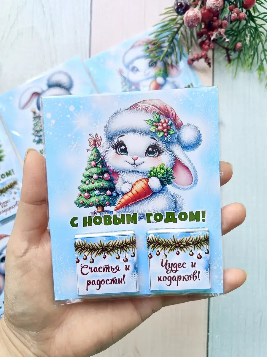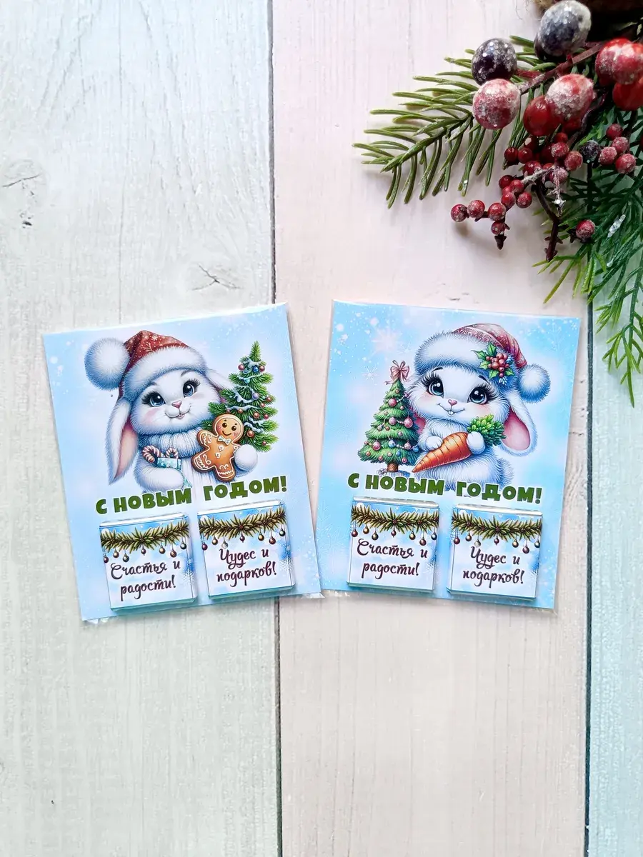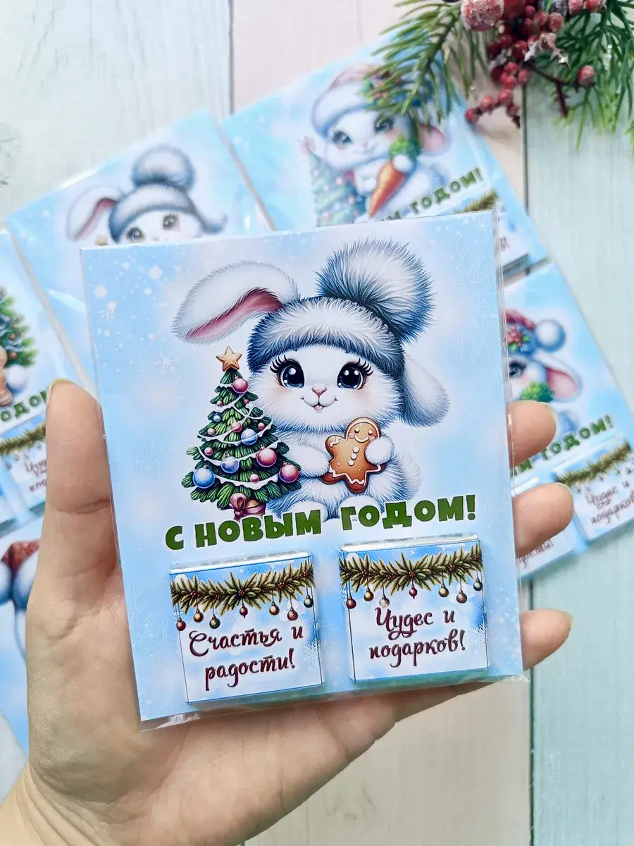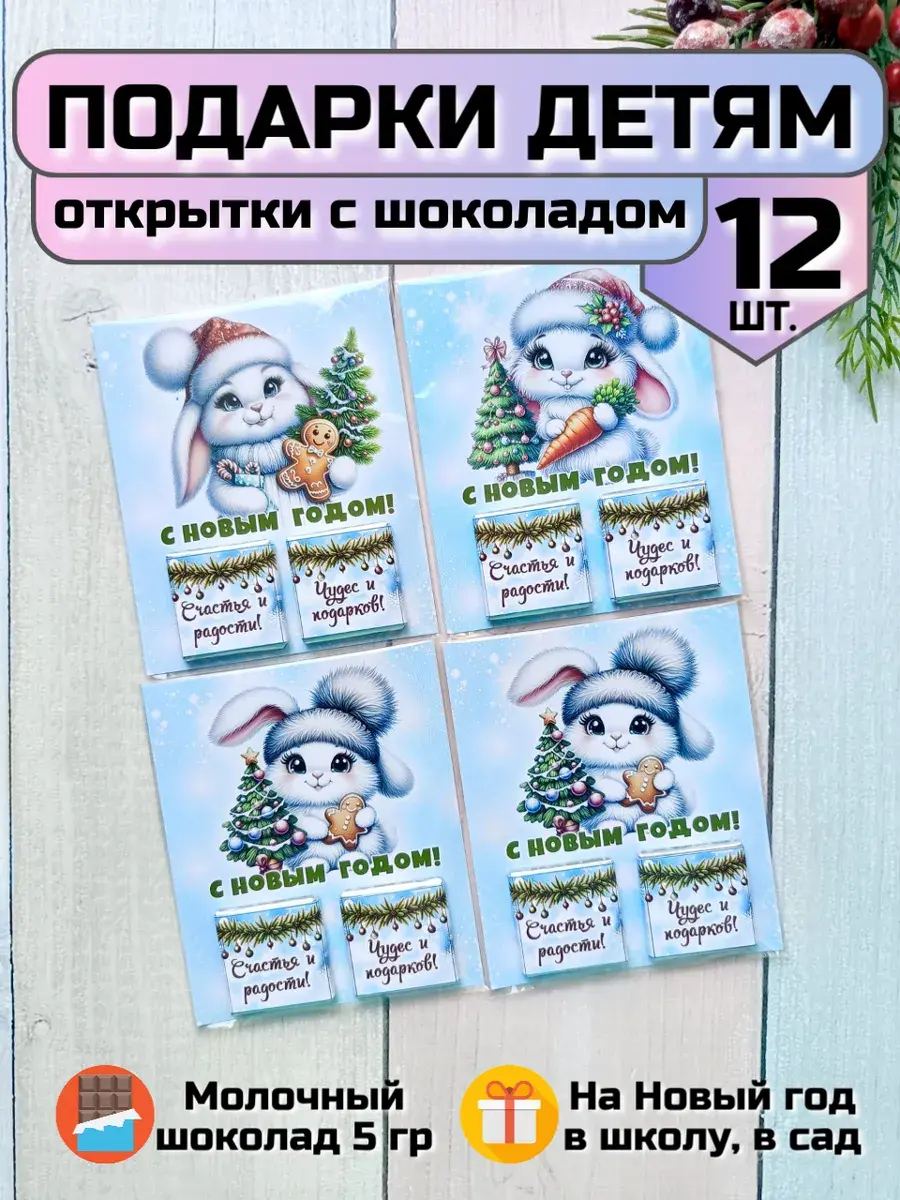 Набор сладких открыток идеально подойдет для всего класса или группы детского сада, ведь открытки сложены по 12 штук в упаковке ( 3 вида разных зайчиков по 4 штуки каждого). А если презент останется его можно подарить сыну, дочке, друзьям детей, детям друзьям, внуку или внучке как небольшое поздравление и знак внимания, который послужит отличным угощением к чаю. Яркие открытки с добрыми пожеланиями не оставят никого равнодушным и шоколад добавит вкусную нотку в предвкушении новогоднего волшебства и зимних каникул.