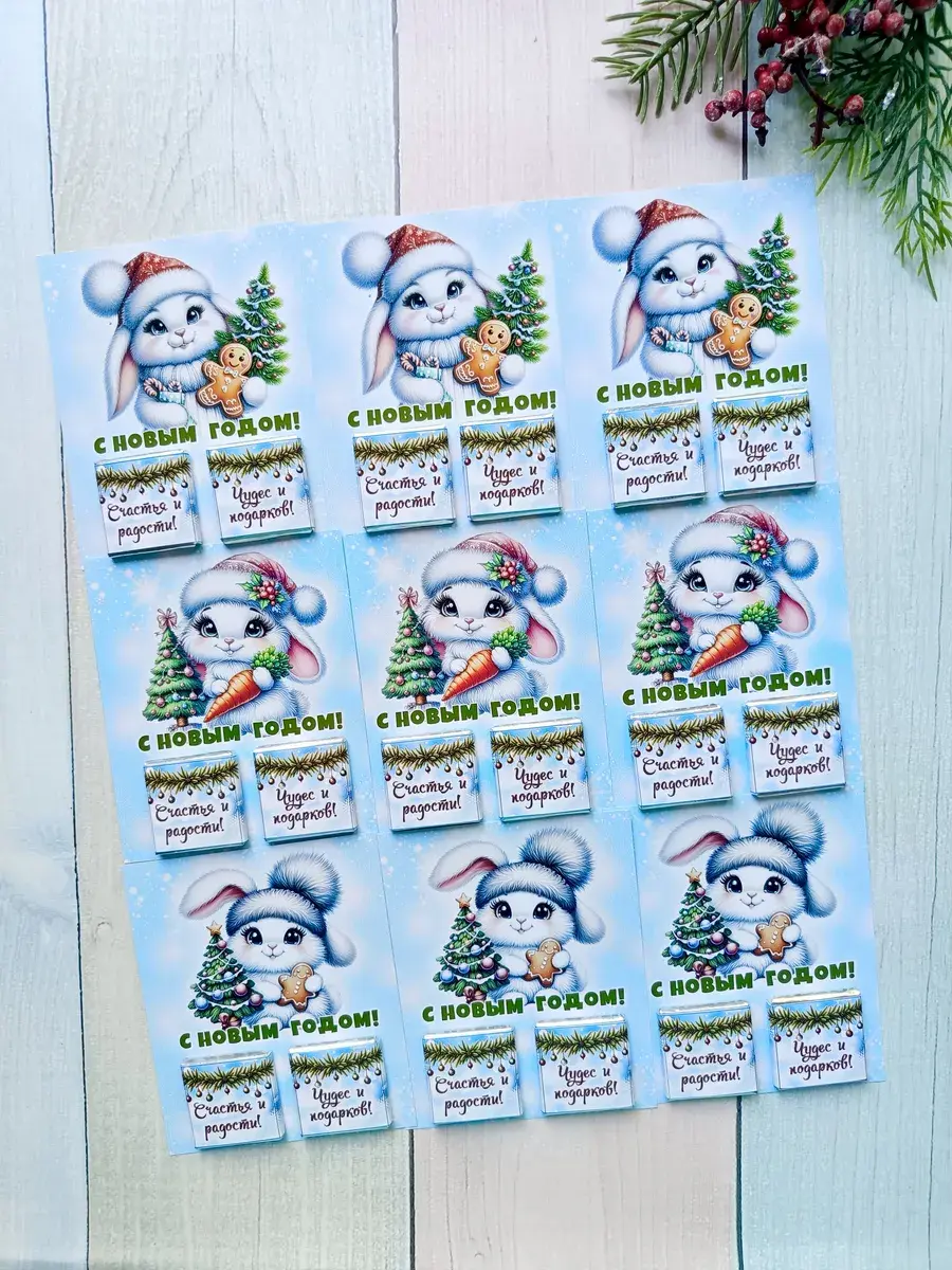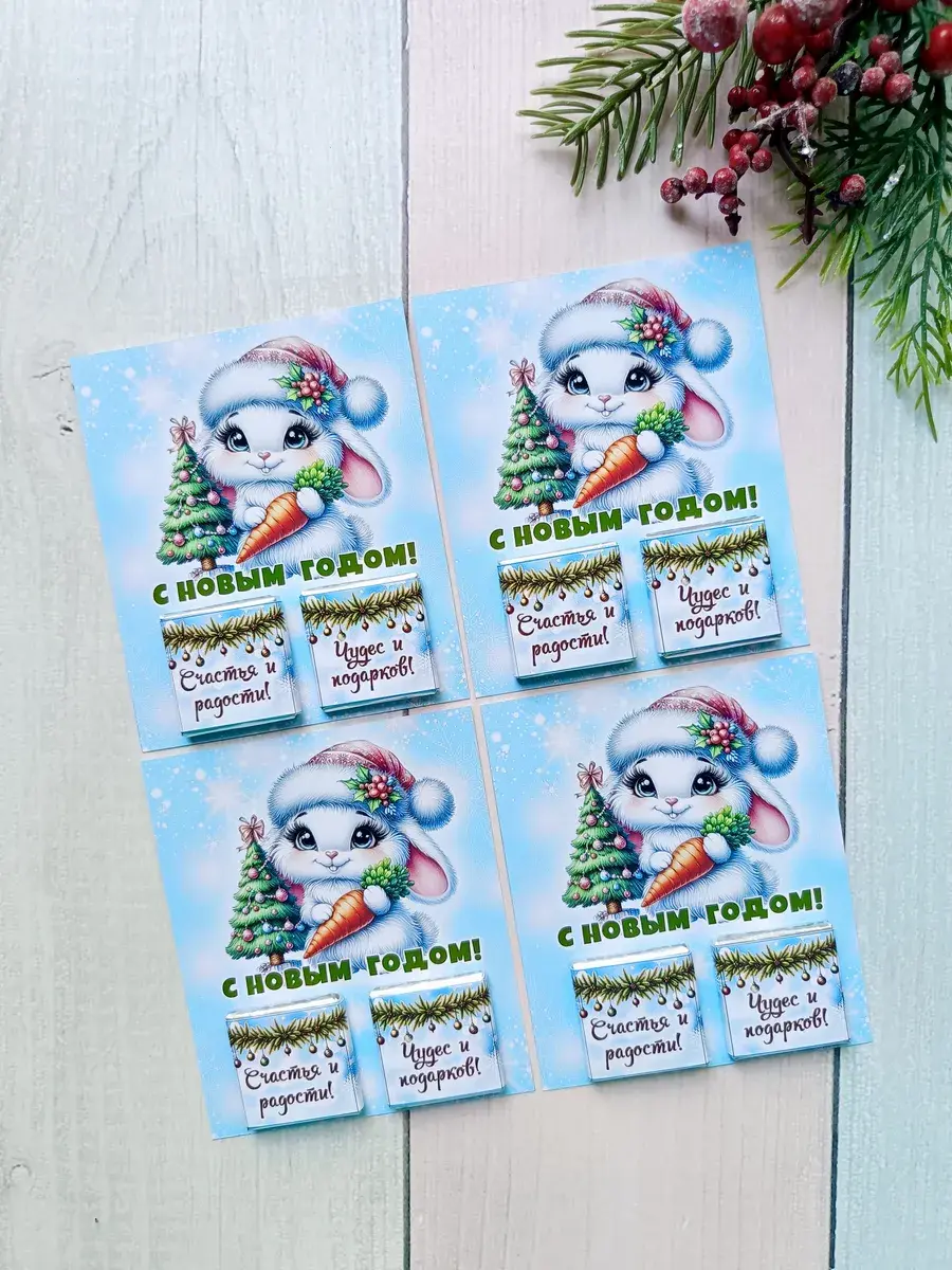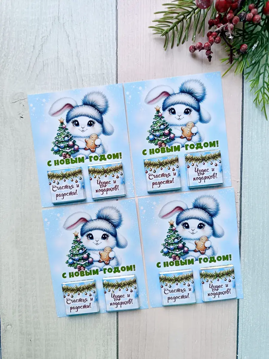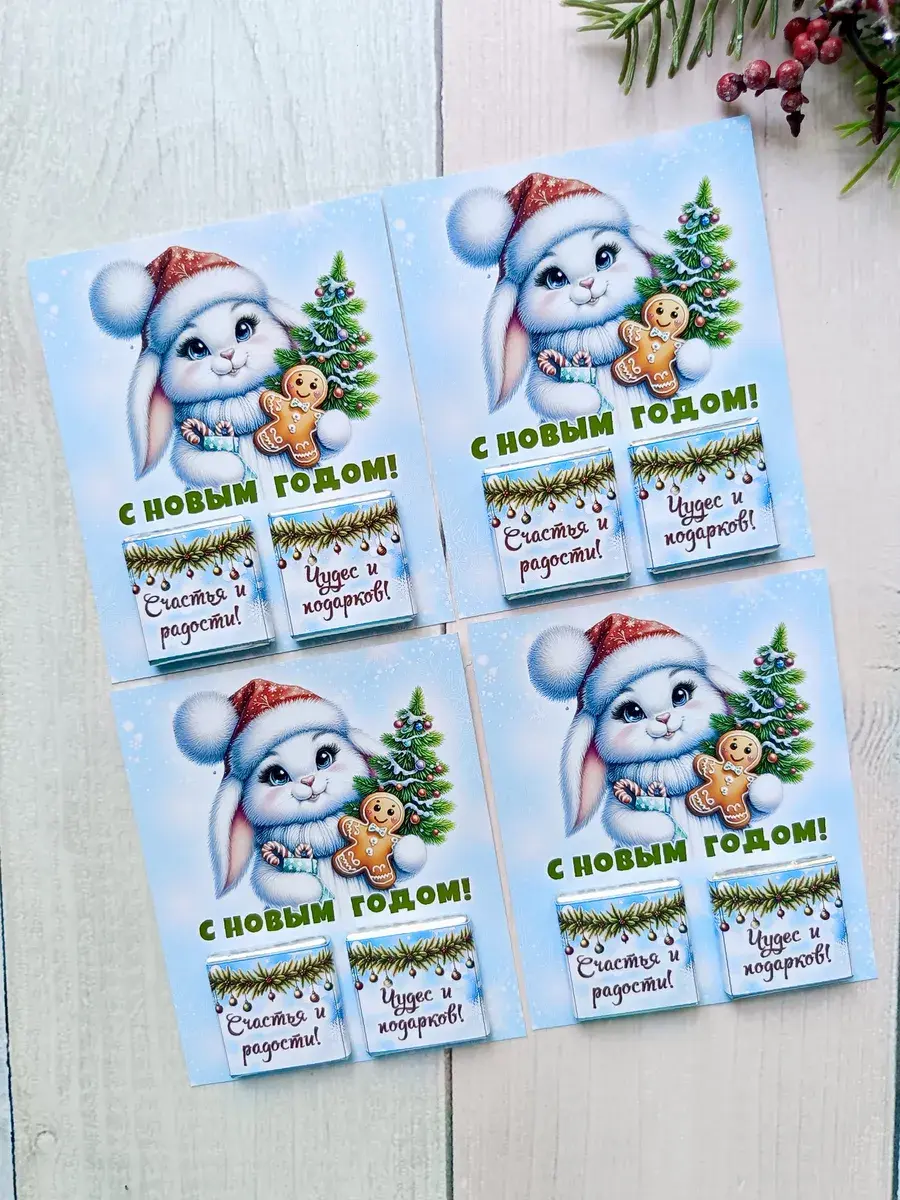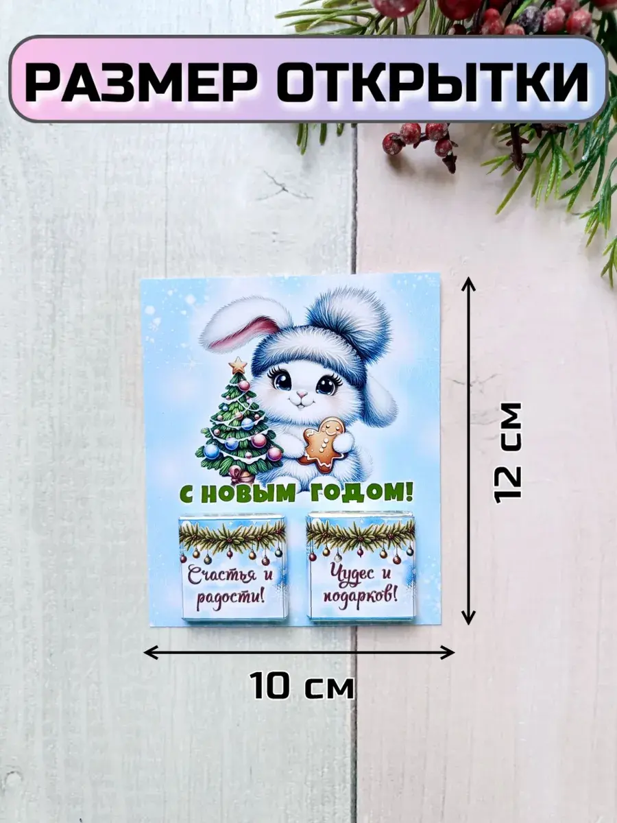 Набор сладких открыток идеально подойдет для всего класса или группы детского сада, ведь открытки сложены по 12 штук в упаковке ( 3 вида разных зайчиков по 4 штуки каждого). А если презент останется его можно подарить сыну, дочке, друзьям детей, детям друзьям, внуку или внучке как небольшое поздравление и знак внимания, который послужит отличным угощением к чаю. Яркие открытки с добрыми пожеланиями не оставят никого равнодушным и шоколад добавит вкусную нотку в предвкушении новогоднего волшебства и зимних каникул.