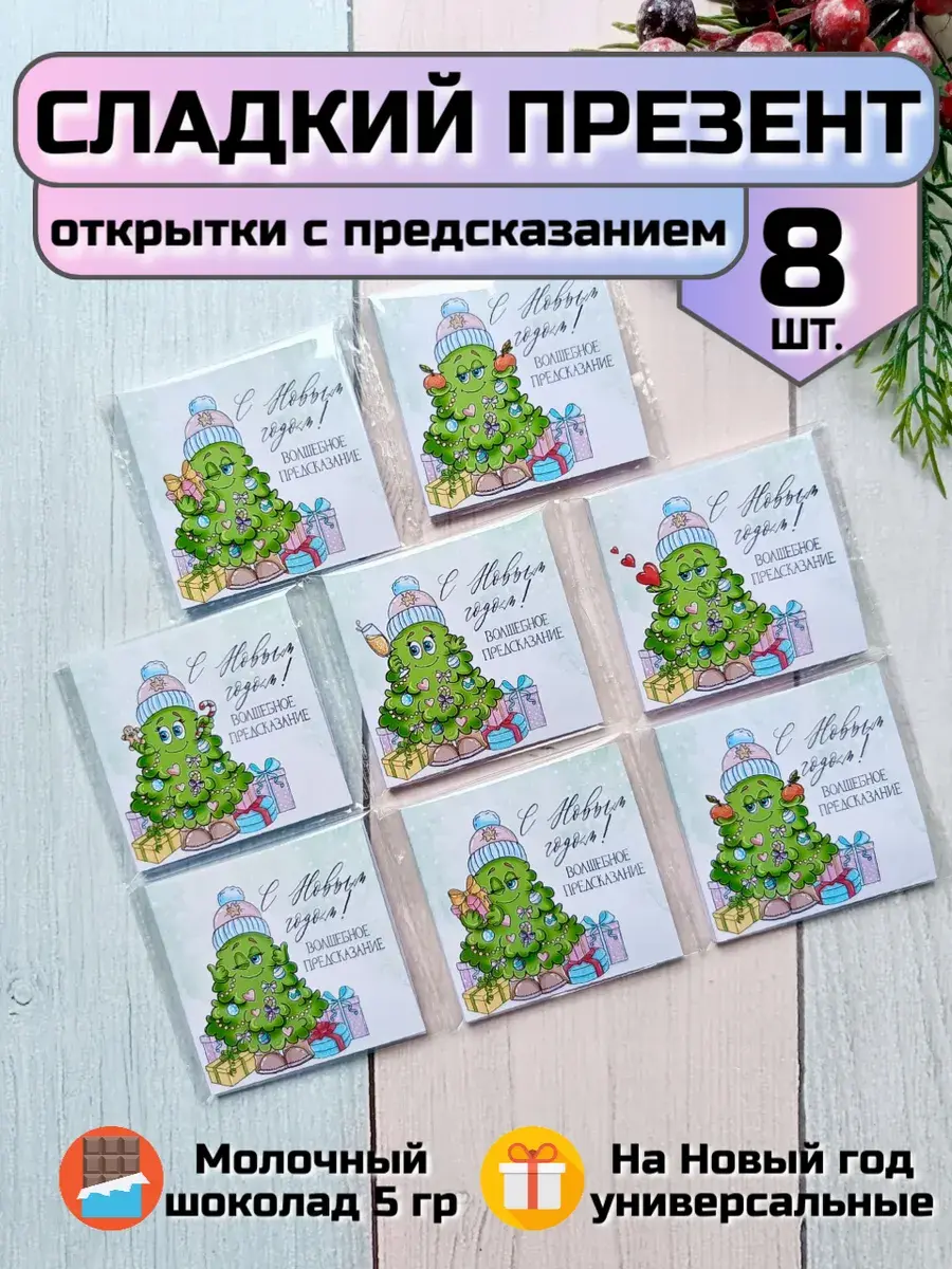 Набор сладких открыток идеально подойдет для друзей, для коллег, для родных и знакомых. В коробке по 8 сладких открыток, поэтому легко заказать необходимое количество. А если презент останется его можно подарить сыну, дочке, друзьям детей, детям друзьям, внуку или внучке как небольшое поздравление и знак внимания, который послужит отличным угощением к чаю. Яркие открытки с добрыми или шуточными предсказаниями не оставят никого равнодушным, а шоколад добавит вкусную нотку в предвкушении новогоднего волшебства и зимних каникул.