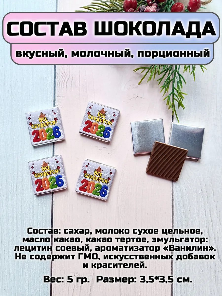 Размер открытки в сложенном виде 7 см х 7 см, внутри молочный порционный шоколад 5 гр. Состав шоколада: сахар, молоко сухое цельное, масло какао, какао тертое, эмульгаторы: лецитин соевый, Е476; ароматизаторы. Без ГМО, без консервантов. 32% какао.