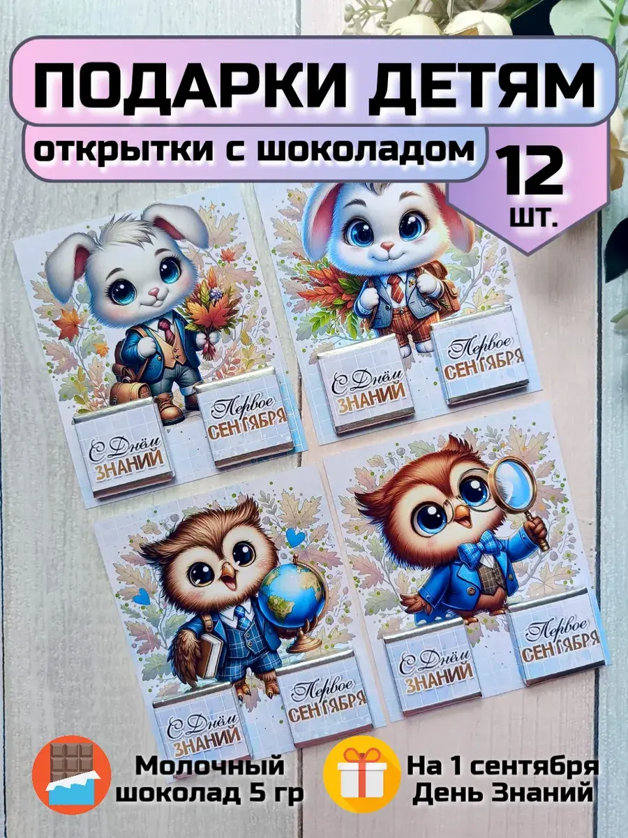 Набор сладких открыток идеально подойдет для всего класса, ведь наборы сложены по 12 штук в упаковке. Если не хватит, то товар можно дозаказать по одной открытке (смотрите в ассортименте магазина). А если презент останется его можно подарить сыну, дочке, друзьям детей, детям друзьям, внуку или внучке как небольшое поздравление и знак внимания, который послужит отличным угощением к чаю. Яркие открытки с добрыми пожеланиями не оставят никого равнодушным и шоколад добавит вкусную нотку в первый школьный день. Такой подарок станет отличным дополнением к праздничной линейке на День Знаний.
