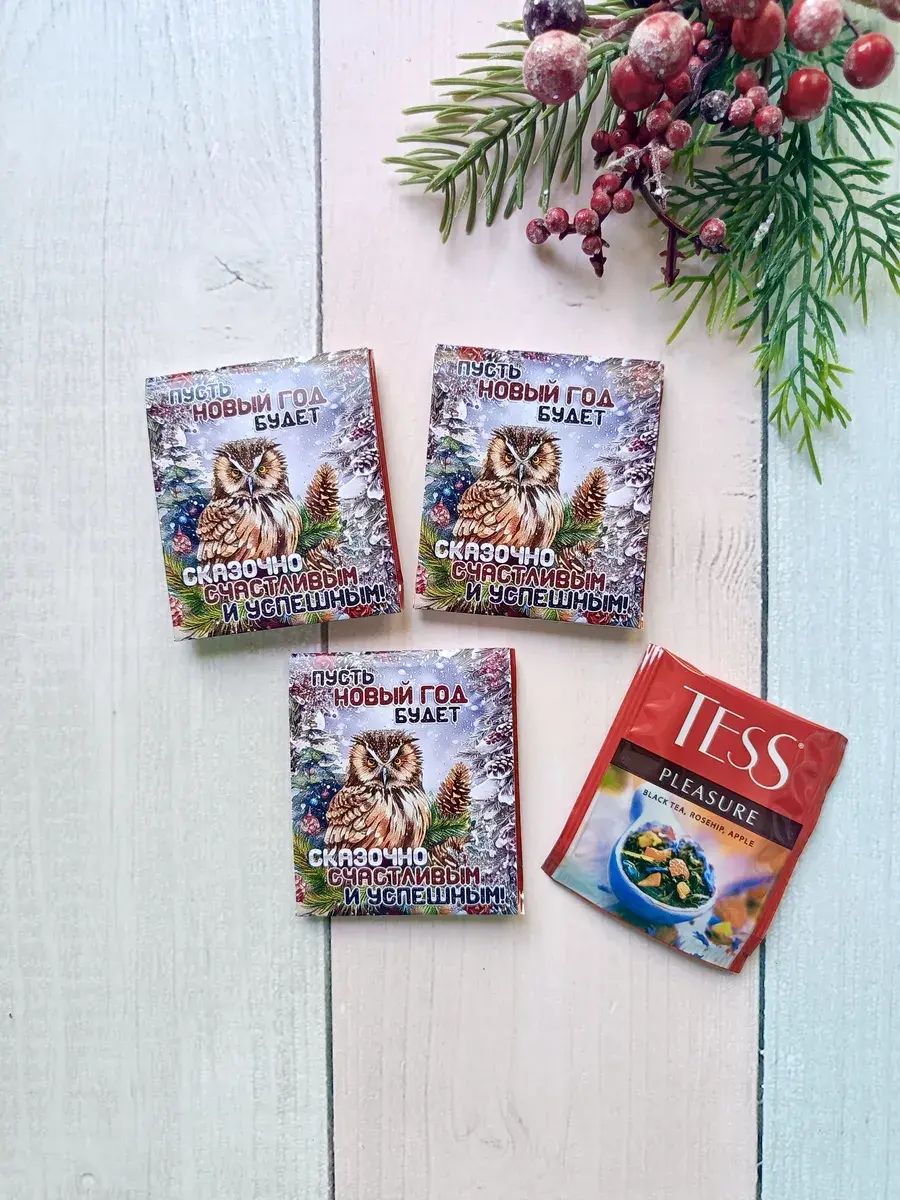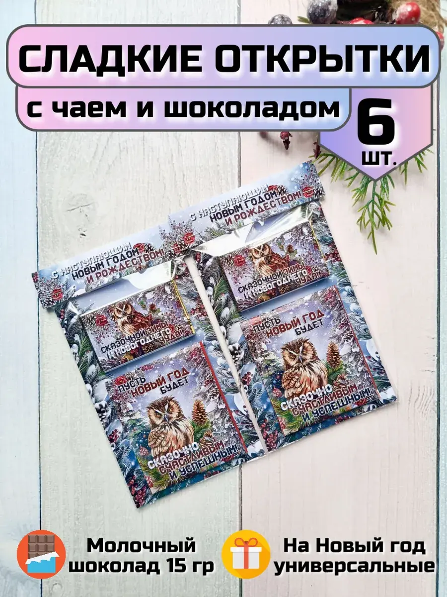 Размер открытки 9 см х 14 см, размер готового презента с упаковкой 10 см х 16,5 см. Внутри плитка классического молочного шоколада 15 гр. и пакетик чая "Тесс".