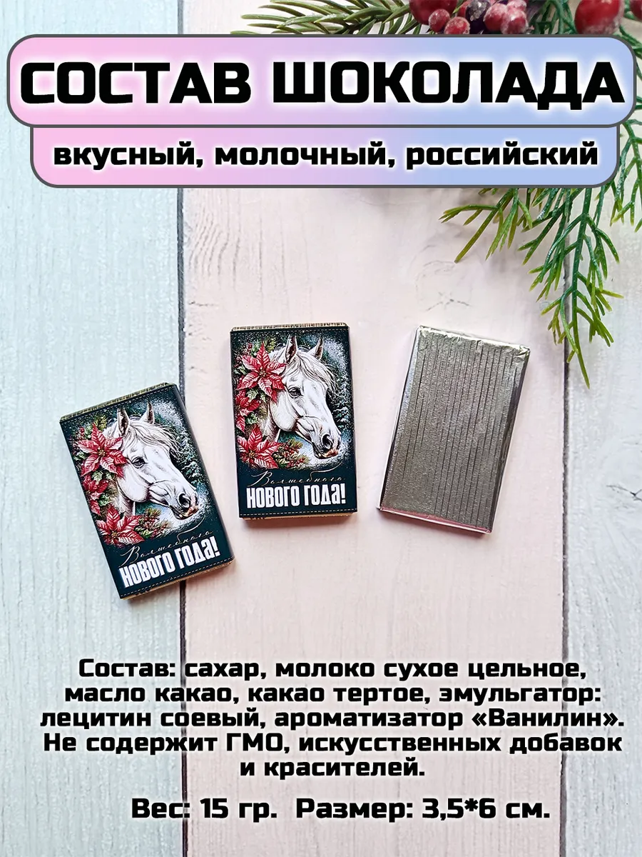 Размер открытки 6 см х 8,5 см, внутри плитка классического молочного шоколада 15 гр. Состав шоколада: сахар, молоко сухое цельное, масло какао, какао тертое, эмульгаторы: лецитин соевый, Е476; ароматизатор «Ванилин». Без ГМО, без консервантов. 25% какао.