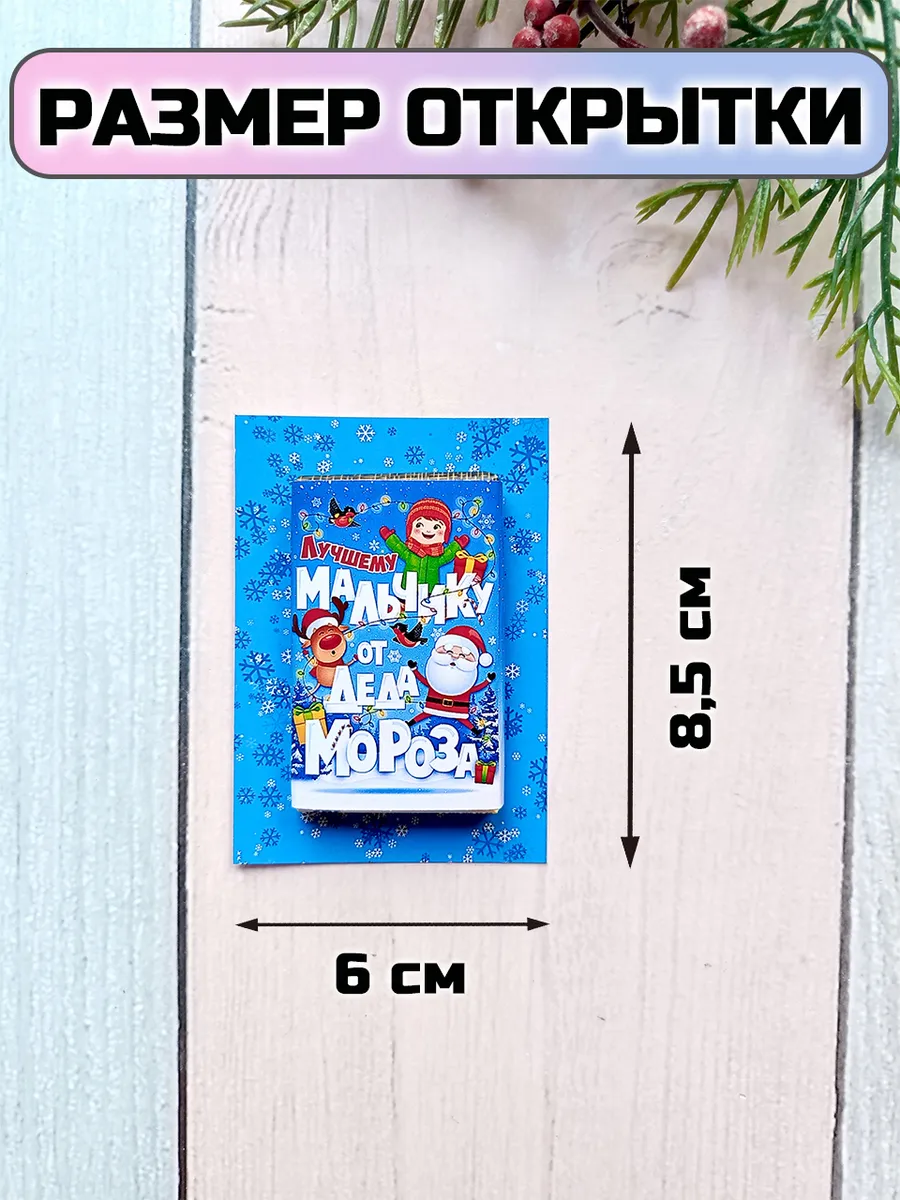 Подарочные открытки на Новый год с шоколадом от бренда «Липомания» – это яркий и приятный презент, который создает праздничное новогоднее настроение. Такой подарок сочетает в себе теплые пожелания и сладкий сюрприз для мальчиков.