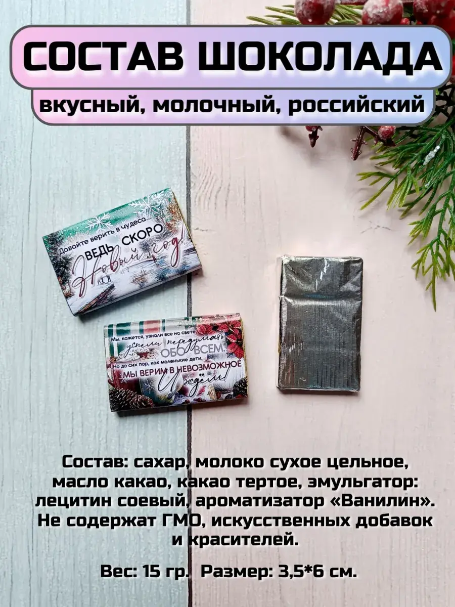 Размер открытки 7 см х 10 см, внутри плитка классического молочного шоколада 15 гр. Состав шоколада: сахар, молоко сухое цельное, масло какао, какао тертое, эмульгаторы: лецитин соевый, Е476; ароматизатор «Ванилин». Без ГМО, без консервантов. 25% какао.