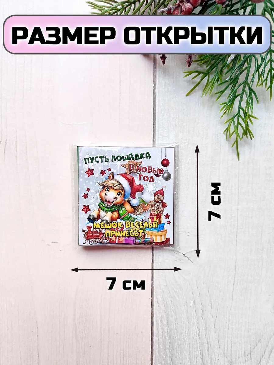 Размер открытки в сложенном виде 7 см х 7 см, внутри молочный порционный шоколад 5 гр. Состав шоколада: сахар, молоко сухое цельное, масло какао, какао тертое, эмульгаторы: лецитин соевый, Е476; ароматизаторы. Без ГМО, без консервантов. 32% какао.