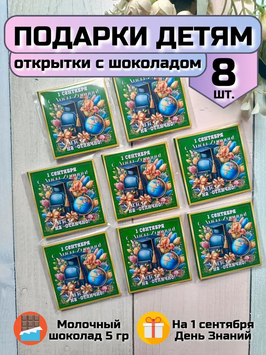 Набор сладких открыток идеально подойдет для всего класса, ведь наборы сложены по 8 штук: 8 шт мальчикам, 8 штук девочкам и 8 штук ассорти (4 мальчикам и 4 девочкам). А если презент останется его можно подарить сыну, дочке, друзьям детей, детям друзьям, внуку или внучке как небольшое поздравление и знак внимания, который послужит отличным угощением к чаю. Яркие открытки с добрыми пожеланиями не оставят никого равнодушным и шоколад добавит вкусную нотку в первый школьный день. Такой подарок станет отличным дополнением к праздничной линейке на День Знаний.
