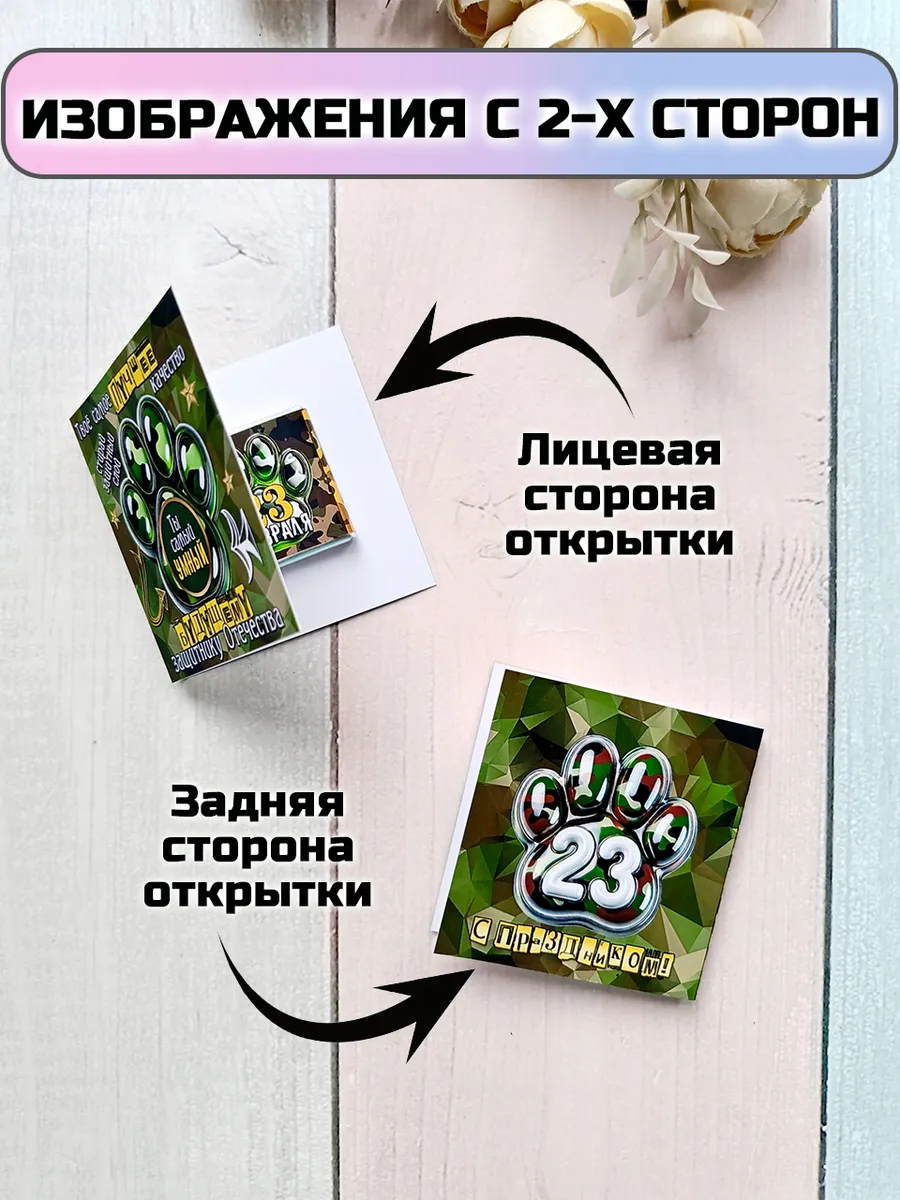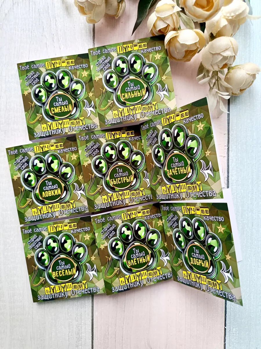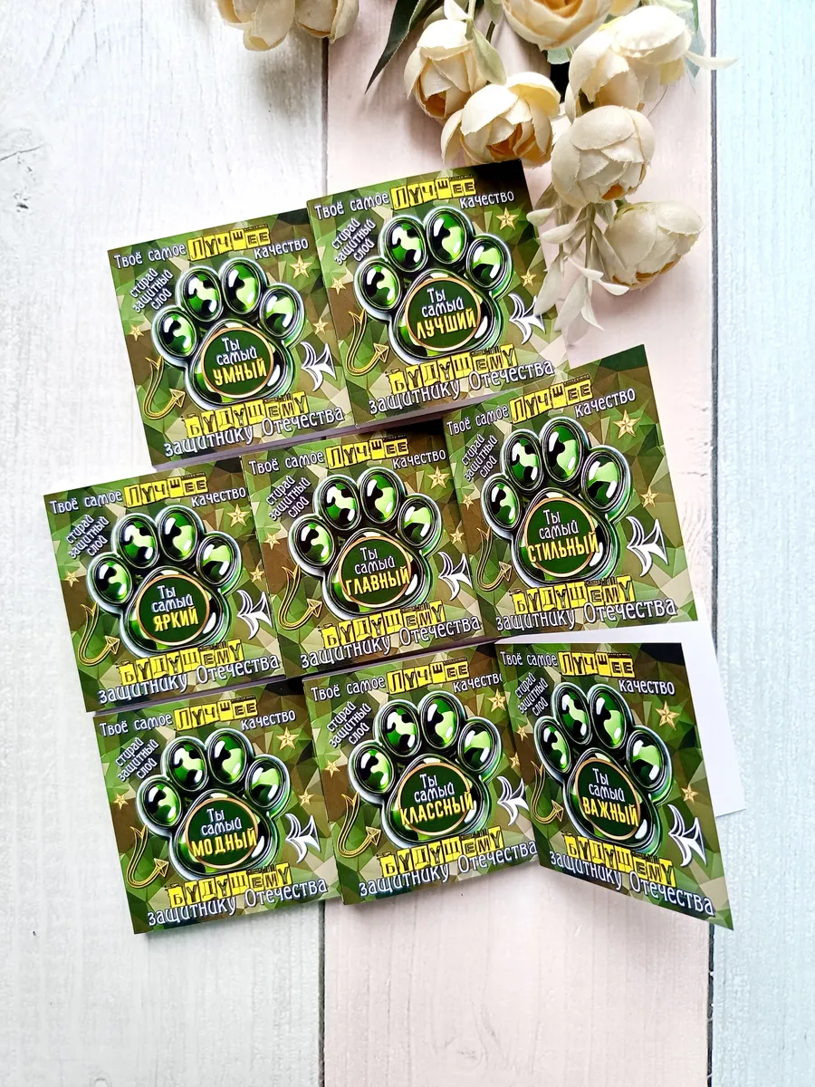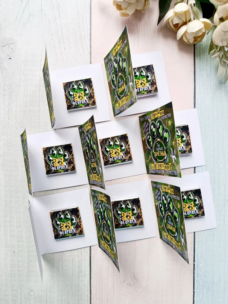 Подарочные открытки "Будущему защитнику" со скретч-наклейками на 23 февраля с шоколадной плиткой внутри от бренда «Липомания» – это яркий и приятный презент, который создает праздничное настроение. Такой подарок сочетает в себе интересное рандомное качество и комплимент, которое можно прочитать сотря монеткой защитный слой, и сладкий сюрприз.