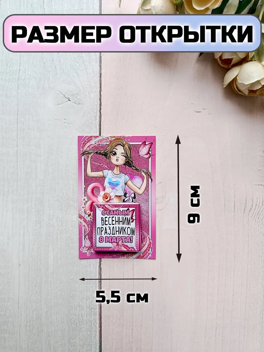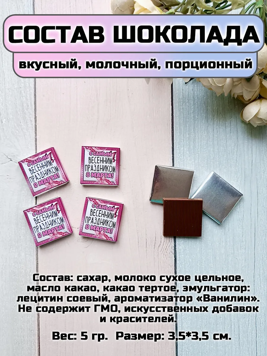 Размер открытки 5,5 см х 9 см, молочный порционный шоколад 5 гр. Состав шоколада: сахар, молоко сухое цельное, масло какао, какао тертое, эмульгаторы: лецитин соевый, Е476; ароматизаторы. Без ГМО, без консервантов. 32% какао.