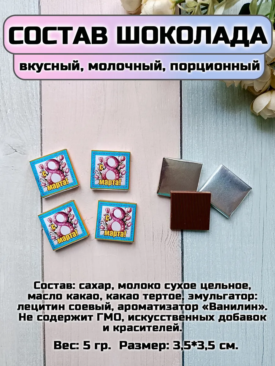 Размер открытки 5,5 см х 9 см, молочный порционный шоколад 5 гр. Состав шоколада: сахар, молоко сухое цельное, масло какао, какао тертое, эмульгаторы: лецитин соевый, Е476; ароматизаторы. Без ГМО, без консервантов. 32% какао.