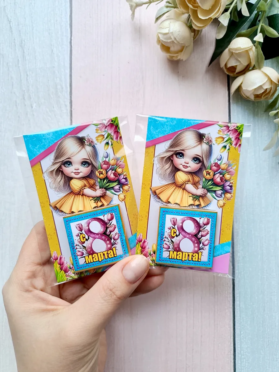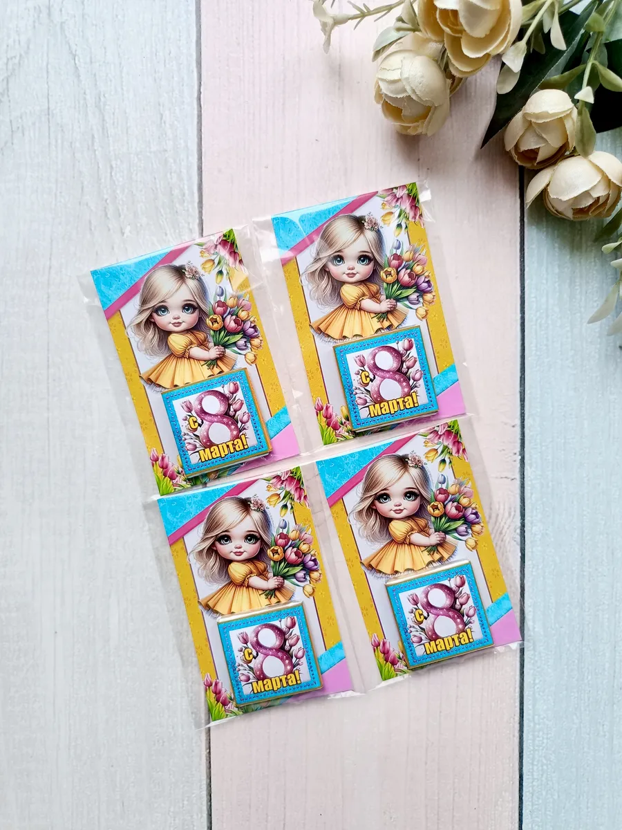 Подарочные открытки "С самым весенним праздником" на 8 марта с плиткой шоколада от бренда «Липомания» – это яркий и приятный презент для школьников и дошкольников, который создаст праздничное настроение. Ведь такой подарок сочетает в себе теплые пожелания и сладкий сюрприз, что особенно нравится детям.