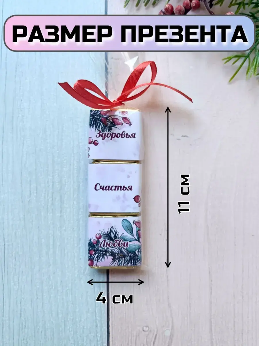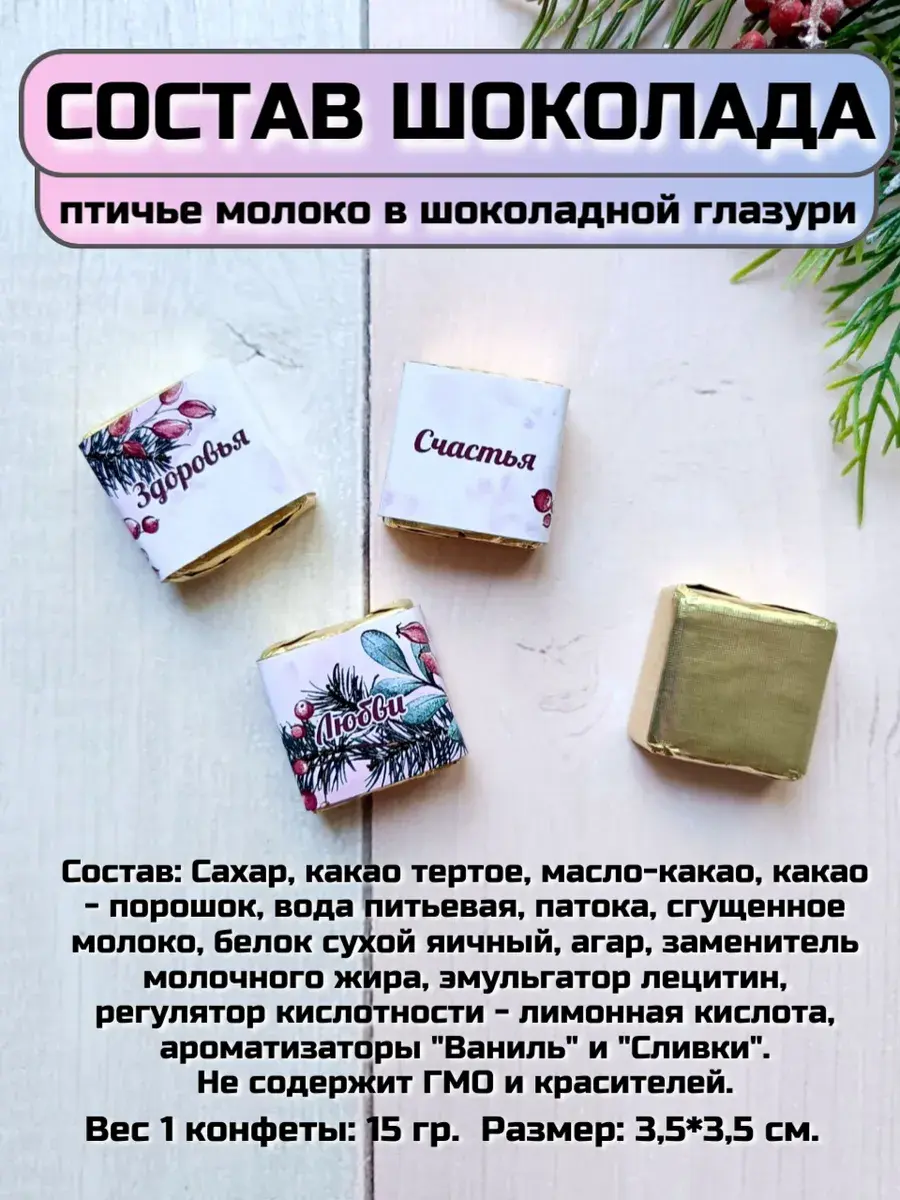 Размер подарка 4 см х 10 см, внутри конфета сливочно-ванильного суфле Птичье молоко 3 штуки в каждом. Состав: сахар, какао тертое, масло-какао, какао - порошок, вода питьевая, патока, сгущенное молоко, белок сухой яичный, агар, заменитель молочного жира, эмульгатор лецитин, регулятор кислотности - лимонная кислота, ароматизаторы "Ваниль" и "Сливки". Не содержит ГМО и красителей.